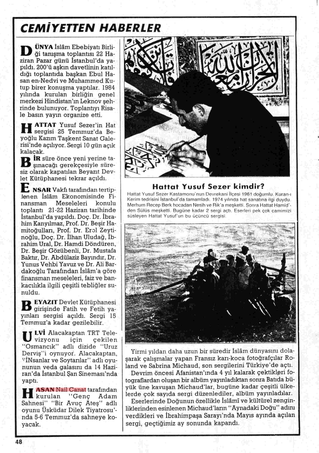 Cemiyetten Haberler Altınoluk Dergisi / 01.07.1986 Dünya İslam Ebebiyatı Birliği tanışma toplantısı 22 Haziran Pazar günü istanbul'da yapıldı. 200'ü aşkın davetlinin katıldığı toplantıda başkan Ebul Hasan en-Nedvi ve Muhammed Kutup birer konuşma yaptılar. 1984 yılında kurulan birliğin genel merkezi Hindistan'ın Leknov şehrinde bulunuyor. Toplantıyı Risale basın yayın organize etti. Hattat Yusuf Sezer'in Hat sergisi 25 Temmuz'da Beyoğlu Kazım Taşkent Sanat Galerisi'nde açılıyor. Sergi 10 gün açık kalacak. Hasan Yusuf Sezer Kimdir? Hasan Yusuf Sezer Kastamonu'nun Devrekanı İlçesi 1961 doğumlu. Kur'an-ı Kerim tedrisini İstanbul'da tamamladı. 1974 yılında Hat sanatına ilgi duydu. Merhum Recep Berk Hoca'dan Nesih ve Rik'a meşketti. Sonra Hattan Hamid'den Sülüs meşketti. Bugüne kadar 2 sergi açtı. Eserleri pek çok camimizi süsleyen Hattat Yusuf'un bu 3. sergisi. Bir süre önce yeni yerine taşınacağı gerekçesiyle süresiz olarak kapatılan Beyazıt Devlet Kütüphanesi tekrar açıldı. Ensar tarafından tertiplenen İslam Ekonomisinde Finansman Meseleleri konulu toplantı 21-22 Haziran tarihinde İstanbul'da yapıldı. Doç. Dr. İbrahim Kanyilmaz, Prof. Dr. Beşir Hamitoğulları, Prof. Dr. Erol Zeytinoğlu, Doç. Dr. İlhan Uludağ, İbrahim Ural, Dr. Hamdi Döndüren, Dr. Beşir Gözübenli, Dr. Mustafa Bakür, Dr. Abdülaziz Bayındır, Dr. Yunus Vehbi Yavuz ve Dr. Ali Bardakoğlu Tarafından İslam'a göre finansman meseleleri, faiz ve bankacılıkla ilgili çeşitli tebliğler sunuldu. Beyazıt Devlet Kütüphanesi girişinde Fatih ve Fetih yayınları sergisi açıldı. Sergi 15 Temmuz'a kadar gezilebilir. Ulvi Alacakaptan TRT Televizyonu için çekilen "Osmancık" adlı dizide "Uruz Dervış"ı oynuyor. Alacakaptan, 'İnsanlar ve Soytarılar" adlı oyu-nunun veda galasını da 14 Hazi-ran'da İstanbul Şan Sinemasi'nda yaptı. Hasan Nail Canat tarafından kurulan "Genç Adam Sahnesi" "Bir Avuç Ateş" adlı oyunu Üsküdar Dilek Tiyatrosunda 5-6 Temmuz'da sahneye koyacak. Yirmi yıldan daha uzun bir süredir islam dünyasını dolaşarak çalışmalar yapan Fransız karıkoca fotoğrafçılar Roland ve Sabrina Michaud, son sergilerim Türkiye'de açtı. Devrim öncesi Afanistan'ında 4 yıl kalarak çektikleri fotoğraflardan oluşan bir albüm yayınladıktan sonra Batıda büyük üne kavuşan Michaud'lar, bugüne kadar çeşitli ülkelerde çok sayıda sergi düzenlediler, albüm yayınladılar. Eserlerinde Doğunun özellikle İslamî ve kültürel zenginliklerinden esinlenen Michaud'ların "Aynadaki Doğu" adını verdikleri ve İbrahim paşa Sarayı'nda Mayıs ayında açılan sergi, geçtiğimiz ay sonunda kapandı. |