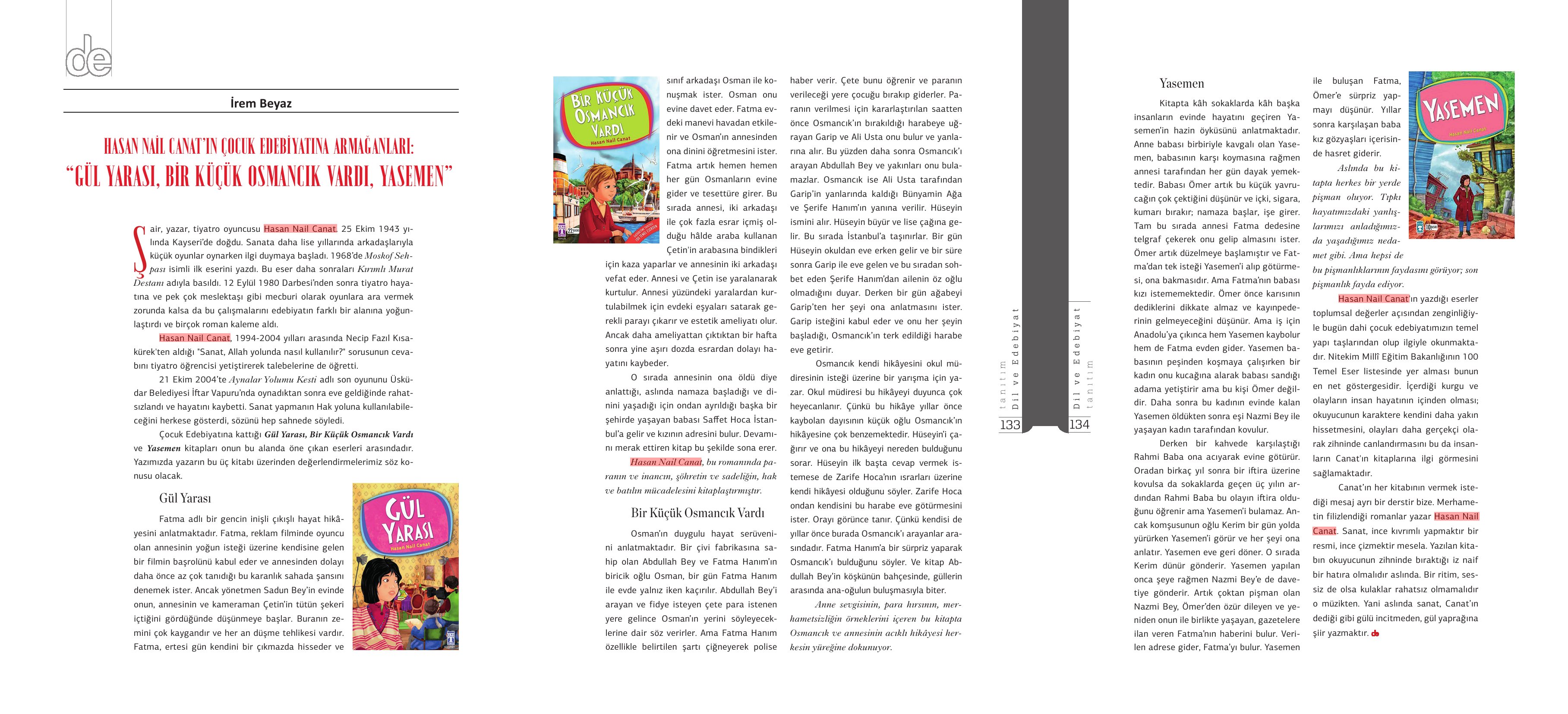 İrem Beyaz / Hasan Nail Canat'ın Çocuk Edebiyatına Armağanları: "Gül Yarası, Bir Küçük Osmancık Vardı, Yasemen" Dil ve Edebiyat Dergisi / 01.10.2021 Şair, yazar, tiyatro oyuncusu Hasan Nail Canat. 25 Ekim 1943 yılında Kayseri'de doğdu. Sanata daha lise yıllarında arkadaşlarıyla küçük oyunlar oynarken ilgi duymaya başladı. 1968'de Moskof Sehpası isimli ilk eserini yazdı. Bu eser daha sonraları Kırımlı Murat Destanı adıyla basıldı. 12 Eylül 1980 Darbesi'nden sonra tiyatro hayatına ve pek çok meslektaşı gibi mecburi olarak oyunlara ara vermek zorunda kalsa da bu çalışmalarını edebiyatın farklı bir alanına yoğunlaştırdı ve birçok roman kaleme aldı. Hasan Nail Canat, 1994-2004 yılları arasında Necip Fazıl Kısakürek'ten aldığı "Sanat, Allah yolunda nasıl kullanılır?" sorusunun cevabını tiyatro öğrencisi yetiştirerek talebelerine de öğretti. 21 Ekim 2004'te Aynalar Yolumu Kesti adlı son oyununu Üsküdar Belediyesi İftar Vapuru'nda oynadıktan sonra eve geldiğinde rahatsızlandı ve hayatını kaybetti. Sanat yapmanın Hak yoluna kullanılabileceğini herkese gösterdi, sözünü hep sahnede söyledi. Çocuk Edebiyatı'na kattığı Gül Yarası, Bir Küçük Osmancık Vardı ve Yasemen kitapları onun bu alanda öne çıkan eserleri arasındadır. Yazımızda yazarın bu üç kitabı üzerinden değerlendirmelerimiz söz konusu olacak. Gül Yarası Fatma adlı bir gencin inişli çıkışlı hayat hikâyesini anlatmaktadır. Fatma, reklam filminde oyuncu olan annesinin yoğun isteği üzerine kendisine gelen bir filmin başrolünü kabul eder ve annesinden dolayı daha önce az çok tanıdığı bu karanlık sahada şansını denemek ister. Ancak yönetmen Sadun Bey'in evinde onun, annesinin ve kameraman Çetin'in tütün şekeri içtiğini gördüğünde düşünmeye başlar. Buranın zemini çok kaygandır ve her an düşme tehlikesi vardır. Fatma, ertesi gün kendini bir çıkmazda hisseder ve sınıf arkadaşı Osman ile konuşmak ister. Osman onu evine davet eder. Fatma evdeki manevi havadan etkilenir ve Osman'ın annesinden ona dinini öğretmesini ister. Fatma artık hemen hemen her gün Osmanların evine gider ve tesettüre girer. Bu sırada annesi, iki arkadaşı ile çok fazla esrar içmiş olduğu hâlde araba kullanan Çetin'in arabasına bindikleri için kaza yaparlar ve annesinin iki arkadaşı vefat eder. Annesi ve Çetin ise yaralanarak kurtulur. Annesi yüzündeki yaralardan kurtulabilmek için evdeki eşyaları satarak gerekli parayı çıkarır ve estetik ameliyatı olur. Ancak daha ameliyattan çıktıktan bir hafta sonra yine aşırı dozda esrardan dolayı hayatını kaybeder. O sırada annesinin ona öldü diye anlattığı, aslında namaza başladığı ve dinini yaşadığı için ondan ayrıldığı başka bir şehirde yaşayan babası Saffet Hoca İstanbul'a gelir ve kızının adresini bulur. Devamını merak ettiren kitap bu şekilde sona erer. zHasan Nail Canat, bu romanında paranın ve inancın, şöhretin ve sadeliğin, hak ve batılın mücadelesini kitaplaştırmıştır. Bir Küçük Osmancık Vardı Osman'ın duygulu hayat serüvenini anlatmaktadır. Bir çivi fabrikasına sahip olan Abdullah Bey ve Fatma Hanım'ın biricik oğlu Osman, bir gün Fatma Hanım ile evde yalnız iken kaçırılır. Abdullah Bey'i arayan ve fidye isteyen çete para istenen yere gelince Osman'ın yerini söyleyeceklerine dair söz verirler. Ama Fatma Hanım özellikle belirtilen şartı çiğneyerek polise haber verir. Çete bunu öğrenir ve paranın verileceği yere çocuğu bırakıp giderler. Paranın verilmesi için kararlaştırılan saatten önce Osmancık'ın bırakıldığı harabeye uğrayan Garip ve Ali Usta onu bulur ve yanlarına alır. Bu yüzden daha sonra Osmancık'ı arayan Abdullah Bey ve yakınları onu bulamazlar. Osmancık ise Ali Usta tarafından Garip'in yanlarında kaldığı Bünyamin Ağa ve Şerife Hanım'ın yanına verilir. Hüseyin ismini alır. Hüseyin büyür ve lise çağına gelir. Bu sırada İstanbul'a taşınırlar. Bir gün Hüseyin okuldan eve erken gelir ve bir süre sonra Garip ile eve gelen ve bu sıradan sohbet eden Şerife Hanım'dan ailenin öz oğlu olmadığını duyar. Derken bir gün ağabeyi Garip'ten her şeyi ona anlatmasını ister. Garip isteğini kabul eder ve onu her şeyin başladığı, Osmancık'ın terk edildiği harabe eve getirir. Osmancık kendi hikâyesini okul müdiresinin isteği üzerine bir yarışma için yazar. Okul müdiresi bu hikâyeyi duyunca çok heyecanlanır. Çünkü bu hikâye yıllar önce kaybolan dayısının küçük oğlu Osmancık'ın hikâyesine çok benzemektedir. Hüseyin'i çağırır ve ona bu hikâyeyi nereden bulduğunu sorar. Hüseyin ilk başta cevap vermek istemese de Zarife Hoca'nın ısrarları üzerine kendi hikâyesi olduğunu söyler. Zarife Hoca ondan kendisini bu harabe eve götürmesini ister. Orayı görünce tanır. Çünkü kendisi de yıllar önce burada Osmancık'ı arayanlar arasındadır. Fatma Hanım'a bir sürpriz yaparak Osmancık'ı bulduğunu söyler. Ve kitap Abdullah Bey'in köşkünün bahçesinde, güllerin arasında ana-oğulun buluşmasıyla biter. Anne sevgisinin, para hırsının, merhametsizliğin örneklerini içeren bu kitapta Osmancık ve annesinin acıklı hikâyesi herkesin yüreğine dokunuyor. Yasemen Kitapta kâh sokaklarda kâh başka insanların evinde hayatını geçiren Yasemen'in hazin öyküsünü anlatmaktadır. Anne babası birbiriyle kavgalı olan Yasemen, babasının karşı koymasına rağmen annesi tarafından her gün dayak yemektedir. Babası Ömer artık bu küçük yavrucağın çok çektiğini düşünür ve içki, sigara, kumarı bırakır; namaza başlar, işe girer. Tam bu sırada annesi Fatma dedesine telgraf çekerek onu gelip almasını ister. Ömer artık düzelmeye başlamıştır ve Fatma'dan tek isteği Yasemen'i alıp götürmesi, ona bakmasıd