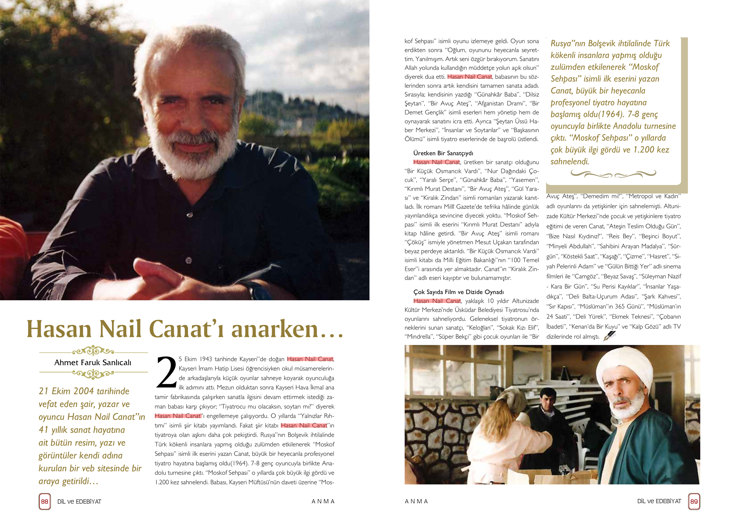 Hasan Nail Canat'ı anarken... Dil ve Edebiyat Dergisi / 01.11.2010 21 Ekim 2004 tarihinde vefat eden şair, yazar ve oyuncu Hasan Nail Canat'ın 41 yıllık sanat hayatına ait bütün resim, yazı ve görüntüler kendi adına kurulan bir web sitesinde bir araya getirildi... 25 Ekim 1943 tarihinde Kayseri'de doğan Hasan Nail Canat,