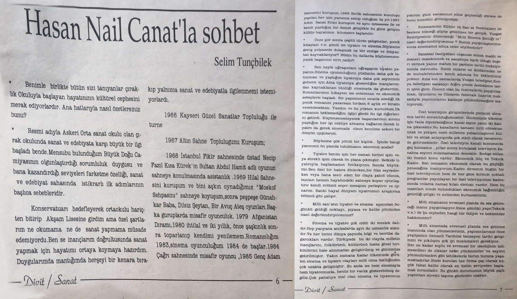 Sanatsal faaliyetleri organize etmek, maddi ve manevi desteklemek ve sanatçıya layık olduğu değeri vermek yalnız malum bir partinin tarihi fonksiyonunda mevcuttu. Bizim onların ne iktidarından ne de muhalefetinden kendi adımıza bir beklentimiz yoktur. Ama son zamanlarda Yozgat Belediyesi, Konya Belediyesi sanatçıyı doğru yönde destekleme tavrı içine girdi. Önemli olan bu festivallerin yaygınlaşması, oyunların ve filmlerin festivale hazırlık maksadıyla yapımcılarını kaliteye yönlendireceğine inanıyorum.