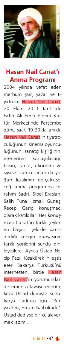 2004 yılında vefat eden merhum şair, yazar ve tiyatrocu Hasan Nail Canat, 20 Ekim 2011 tarihinde Fatih Ali Emiri Efendi Kültür Merkezi'nde Perşembe günü saat 19.30'da anıldı.