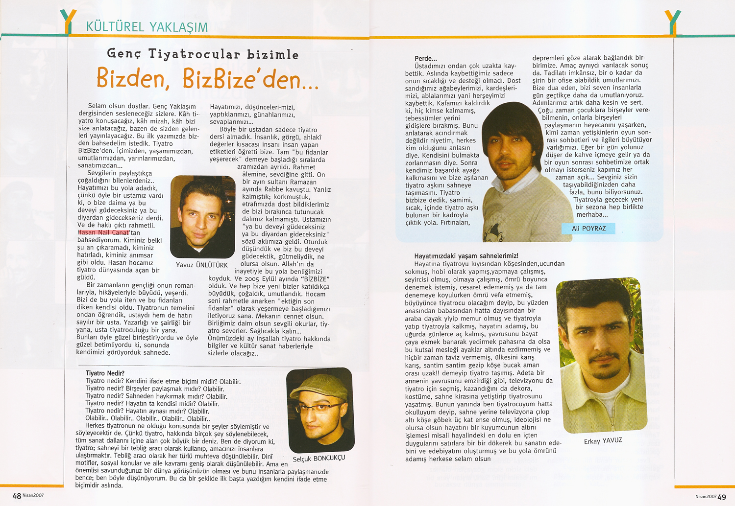 Bizden, Bizbize'den... Genç Yaklaşım Dergisi / 01.04.2007 Yavuz ÜNLÜTÜRK: Selam olsun dostlar. Genç Yaklaşım dergisinden sesleneceğiz sizlere. Kah tiyatro konuşacağız, kah mizah, kah bizi size anlatacağız, bazen de sizden gelenleri yayınlayacağız. Bu ilk yazımızda bizden bahsedelim istedik. Tiyatro Bizbize'den. İçimizden, yaşamımızdan, umutlarımızdan, yarınlarımızdan, sanatımızdan... Sevgilerin paylaştıkça çoğaldığını bilenlerdeniz... Hayatımızı bu yola adadık, çünkü öyle bir ustamız vardı ki, o bize daima ya bu deveyi güdeceksiniz ya bu diyardan gideceksiniz derdi. Ve de haklı çıktı rahmetli. Hasan Nail Canat'tan bahsediyorum. Kiminiz belki şu an çıkaramadı, kiminiz hatırladı, kiminiz anımsar gibi oldu. Hasan hocamız tiyatro dünyasında açan bir güldü. Bir zamanların gençliği onun romanlarıyla, hikayeleriyle büyüdü, yeşerdi. Bizi de bu yola iten ve bu fidanları diken kendisi oldu. Tiyatronun temelini ondan öğrendik, ustaydı hem de hatrı sayılır bir usta. Yazarlığı ve şairliği bir yana, usta tiyatroculuğu bir yana, Bunları öyle güzel birleştiriyordu ve öyle güzel betimliyordu ki, sonunda kendimizi görüyorduk sahnede. Hayatımızı, düşüncelerimizi, yaptıklarımızı, günahlarımızı , sevaplarımızı... Böyle bir ustadan sadece tiyatro dersi almadık. İnsanlık, görgü, ahlaki değerler kısacası insanı insan yapan etiketleri öğretti bize. Tam "bu fidanlar yeşerecek" demeye başladığı sıralarda aramızdan ayrıldı. Rahmet alemine, sevdiğine gitti. On bir ayın sultanı Ramazan ayında Rabbe kavuştu. Yanlız kalmıştık; korkmuştuk, etrafımızda dost bildiklerimiz de bizi bırakınca tutunacak dalımız kalmamıştı. Ustamızın "ya bu deveyi güdeceksiniz ya bu diyardan gideceksiniz" sözü aklıma geldi. Oturduk düşündük ve biz bu deveyi güdecektik, gütmeliydik, ne olursa olsun. Allah'ın da inayetiyle bu yola benliğimizi koyduk. Ve 2005 Eylül ayında "BİZBİZE" olduk. Ve hep bize yeni bizler katıldıkça büyüdük, çoğaldık, umutlandık. Hocam seni rahmetle anarken "ektiğin son fidanlar" olarak yeşermeye başladığımızı iletiyoruz sana. Mekanın cennet olsun. Birliğimiz daim olsun sevgili okurlar, tiyatro severler. Sağlıcakla kalın... Önümüzdeki ay inşallah tiyatro hakkında bilgiler ve kültür sanat haberleriyle sizlerle olacağız... Tiyatro nedir Selçuk BONCUKÇU: Tiyatro nedir? Kendini ifade etme biçimi midir? Olabilir. Tiyatro nedir? Bir şeyler paylaşmak mıdır? Olabilir. Tiyatro nedir? Sahneden haykırmak mıdır? Olabilir. Tiyatro nedir? Hayatın ta kendisi midir? Olabilir. Tiyatro nedir? Hayatın aynası mıdır? Tiyatro nedir? Olabilir... Olabilir... Olabilir... Olabilir... Olabilir... Herkes tiyatronun ne olduğu konusunda bir şeyler söylemiştir ve söyleyecektir de. Çünkü tiyatro, hakkında birçok şey söylenebilecek, tüm sanat dallarını içine alan çok büyük bir deniz. Ben de diyorum ki, tiyatro; sahneyi bir tebliğ aracı olarak kullanıp, amacımızı insanlara ulaştırmaktır. Tebliğ aracı olarak her türlü muhteva düşünülebilir. Dini motifler, sosyal konular ve aile kavramı geniş olarak düşünülebilir. Ama en önemlisi savunduğumuz bir dünya görüşünüzün olması ve bunu insanlarla paylaşmanızdır bence; ben böyle düşünüyorum. Bu da bir şekilde ilk başta yazdığım kendini ifade etme biçimidir aslında. Perde Ali POYRAZ: Üstadımızı ondan çok uzakta kaybettik. Aslında kaybettiğimiz sadece onun sıcaklığı ve desteği olmadı. Dost sandığımız ağabeylerimizi, kardeşlerimizi, ablalarımızı, yani herşeyimizi kaybettik. Kafamızı kaldırdık ki, hiç kimse kalmamış, tebessümler yerini gidişlere bırakmış. Bunu anlatarak acındırmak değildir niyetim, herkes kim olduğunu anlasın diye. Kendisini bulmakta zorlansın diye. Sonra kendimiz başardık ayağa kalkmasını ve bize aşılanan tiyatro aşkını sahneye taşımasını. Tiyatro bizbize dedik, samimi, sıcak, içinde tiyatro aşkı bulunan bir kadroyla çıktık yola. Fırtınaları, depremleri göze alarak bağlandık birbirimize. amaç aynıydı varılacak sonuç da. Tadilatı imkansız, bir o kadar da şirin bir ofise alabildik umutlarımızı. Bize dua eden, bizi seven insanlarla gün geçtikçe daha da umutlanıyoruz. Adımlarımız artık daha kesin ve sert. Çoğu zaman çocuklara birşeyler verebilmenin, onlarla birşeyleri paylaşmanın heyecanını yaşarken, kimi zaman yetişkinlerin oyun sonrası sohbetleri ve ilgileri büyütüyor varlığımızı. Eğer bir gün yolunuz bir oyun sonrası sohbetimize ortak olmayı isterseniz kapımız her zaman açık... Sevginiz sizin taşıyabildiğinizden daha fazla, bunu biliyorsunuz. Tiyatroyla geçecek yeni bir sezona hep birlikte merhaba... Hayatımızdaki yaşam sahnelerimiz! Erkay YAVUZ: Hayatına tiyatroyu kıyısından köşesinden, ucundan sokmuş, hobi olarak yapmış, yapmaya çalışmış, seyircisi olmuş, olmaya çalışmış, ömrü boyunca denemek istemiş, cesaret edememiş ya da denemeye koyulurken ömrü vefa etmemiş, büyüyünce tiyatrocu olacağım deyip, bu yüzden anasından babasından hatta dayısından bir araba dayak yiyip memur olmuş ve tiyatroyla yatıp tiyatroyla kalkmış, hayatına adamış, bu uğurda günlerce aç kalmış, yavrusunu bayat çaya ekmek banarak yedirmek pahasına da olsa bu kutsal mesleği ayaklar altında ezdirmemiş ve hiçbir zaman taviz vermemiş, ülkesini karış karış, santim santim gezip köşe bucak aman orası uzak!! demeyip tiyatro taşımış. Adeta bir annenin yavrusunu emzirdiği gibi, televizyonu da tiyatro için seçmiş, kazandığını da dekora, kostüme, sahne kirasına yetiştirip tiyatrosunu yaşatmış. Bunun yanında ben tiyatrocuyum hatta okulluyum deyip, sahne yerine televizyona çıkıp altı köşe göbek üç kat ense olmuş, ideolojisi ne olursa olsun hayatını bir 