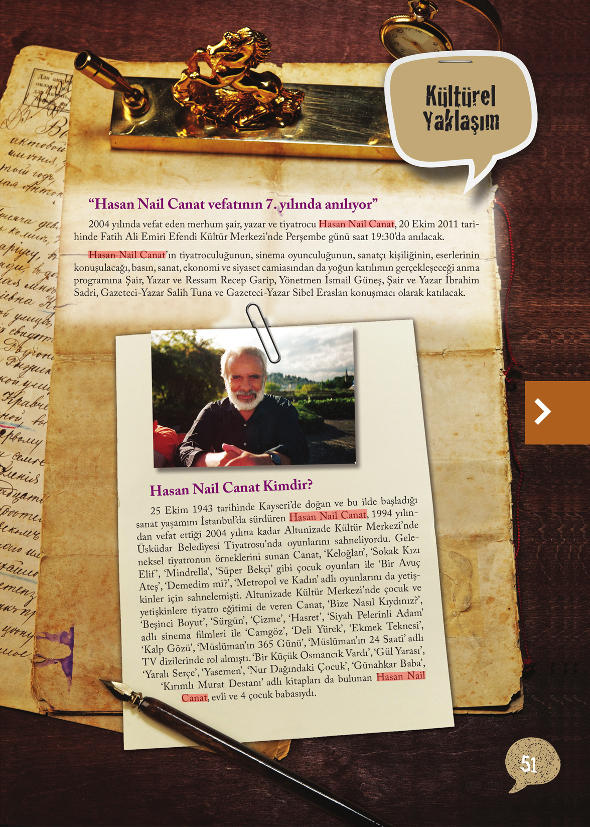 2004 yılında vefat eden merhum şair, yazar ve tiyatrocu Hasan Nail Canat, 20 Ekim 2011 tarihinde Fatih Ali Emiri Efendi Kültür Merkezi'nde Perşembe günü saat 19:30'da anılacak. Hasan Nail Canat'ın tiyatroculuğunun, sinema oyunculuğunun, sanatçı kişiliğinin, eserlerinin konuşulacağı, basın, sanat, ekonomi ve siyaset camiasından da yoğun katılımın gerçekleşeceği anma programına Şair, Yazar ve Ressam Recep Garip, Yönetmen İsmail Güneş, Şair ve Yazar İbrahim Sadri, Gazeteci-Yazar Salih Tuna ve Gazeteci-Yazar Sibel Eraslan konuşmacı olarak katılacak.