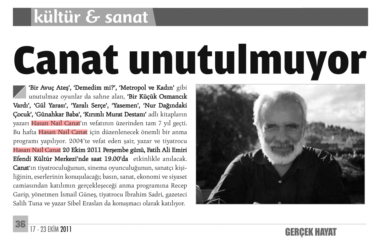 'Bir Avuç Ateş', 'Demedim mi?', 'Metropol ve Kadın' gibi unutulmaz oyunlar da sahne alan, 'Bir Küçük Osmancık Vardı', 'Gül Yarası', 'Yaralı Serçe', 'Yasemen', 'Nur Dağındaki Çocuk', 'Günahkar Baba', 'Kırımlı Murat Destanı' adlı kitapların yazarı Hasan Nail Canat'ın vefatının üzerinden tam 7 yıl geçti. Bu hafta Hasan Nail Canat için düzenlenecek önemli bir anma programı yapılıyor. 2004'te vefat eden şair, yazar ve tiyatrocu Hasan Nail Canat 20 Ekim 2011 Perşembe günü, Fatih Ali Emiri Efendi Kültür Merkezi'nde saat 19.00'da etkinlikle anılacak. Canat'ın tiyatroculuğunun, sinema oyunculuğunun, sanatçı kişiliğinin, eserlerinin konuşulacağı; basın, sanat, ekonomi ve siyaset camiasından katılımın gerçekleşeceği anma programına Recep Garip, yönetmen İsmail Güneş, tiyatrocu İbrahim Sadri, gazeteci Salih Tuna ve yazar Sibel Eraslan da konuşmacı olarak katılıyor.