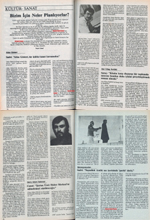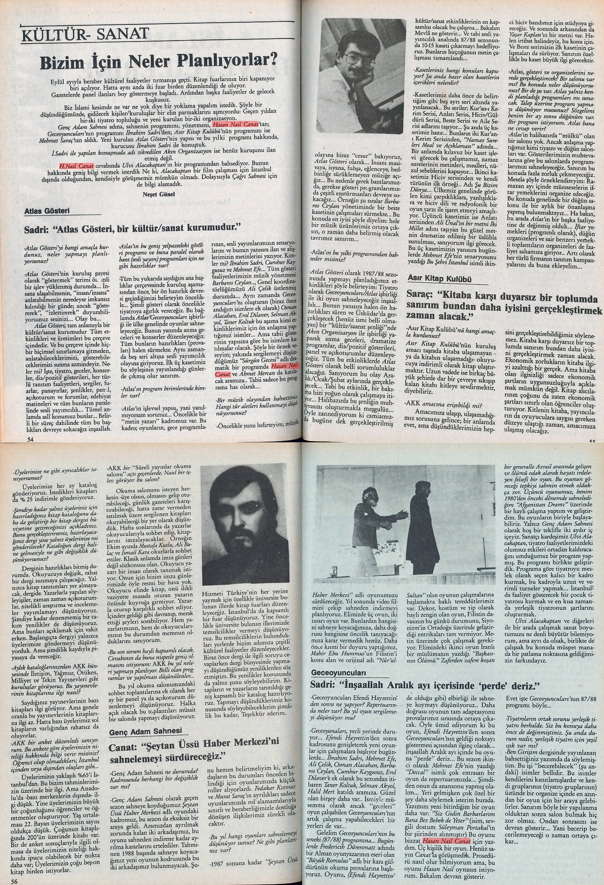 Neşet Günel / Bizim için neler planlıyorlar? Girişim Dergisi / 01.11.1987 Eylül ayıyla beraber kültürel faaliyetler tırmanışa geçti. Kitap fuarlarının biri kapanıyor, biri açılıyor. Hatta aynı anda iki fuar birden düzenlendiği de oluyor. Gazetelerde panel ilanları boy göstermeye başladı. Ardından başka faaliyetler de gelecek kuşkusuz. Biz İslâmi kesimde ne var ne yok diye bir yoklama yapalım istedik. Şöyle bir düşündüğümüzde, gidilecek kişiler/kuruluşlar bir elin parmaklarını aşmıyordu: Geçen yıldan bir-iki tiyatro topluluğu ve yeni kurulan bir-iki organizasyon. Genç Adam Sahnesi adına, sahnenin programını, yönetmeni, Hasan Nail Canat'tan; Geceoyuncuları'nın programını İbrahim Sadri'den; Asır Kitap Kulübü'nün programını ise Mehmet Saraç'tan aldık. Yeni kurulan Atlas Gösteri'nin yapısı ve bu yılki programı hakkında, kurucusu İbrahim Sadri ile konuştuk. İ. Sadri ile yapılan konuşmada adı zikredilen Akın Organizasyon ise henüz kuruluşunu ilan etmiş değil. H. Nail Canat cevabında Ulvi Alacakaptan'ın bir programından bahsediyor. Bunun hakkında geniş bilgi vermek istedik. Ne ki, Alacakaptan bir film çalışması için İstanbul dışında olduğundan, kendisiyle görüşmemiz mümkün olmadı. Dolayısıyla Çağrı Sahnesi için de bilgi alamadık. Atlas Gösteri