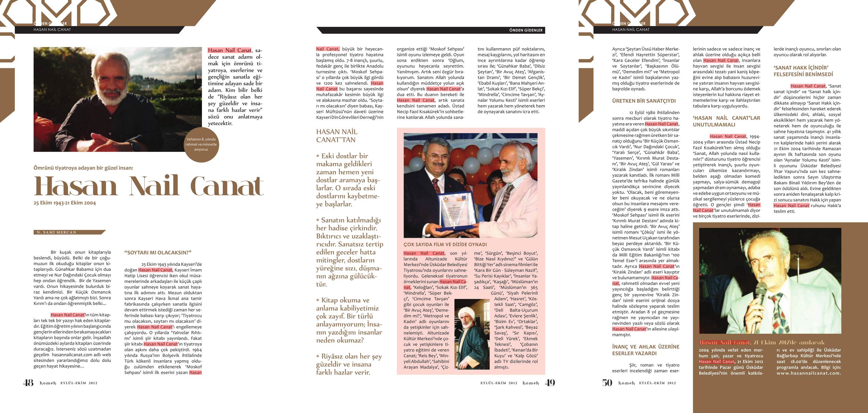 Hasan Nail Canat Komek Dergisi / 01.10.2012 Hasan Nail Canat, sadece sanat adamı olmak için ömrünü tiyatroya, eserlerine ve gençliğin sanatla eğitimine adayan sade bir adam. Kim bilir belki de "Riyâsız olan her şey güzeldir ve insana farklı hazlar verir" sözü onu anlatmaya yetecektir. Bir kuşak onun kitaplarıyla beslendi, büyüdü. Belki de bir çoğumuzun ilk okuduğu kitaplar onun kitaplarıydı. Günahkar Babamız için dua etmeyi ve Nur Dağındaki Çocuk olmayı hep ondan öğrendik. Bir de Yasemen vardı. Onun hikayesinde bulurduk biraz kendimizi. Bir Küçük Osmancık Vardı ama ne çok ağlatmıştı bizi. Sonra Kırım'ı da ondan öğrenmiştik belki... Hasan Nail Canat'ın tüm kitapları tek tek bir yazıyı hak eden kitaplardır. Eğitim öğretim yılının başlangıcında gençlerin ellerinden bırakamayacakları kitapların başında onlar gelir. İnşaallah önümüzdeki aylarda kitapları üzerinde duracağız. İsterseniz sözü uzatmadan geçelim hasannailcanat.com adlı web sitesinden yararlandığımız dolu dolu geçen hayat hikayesine... "SOYTARI MI OLACAKSIN?" 25 Ekim 1943 yılında Kayseri'de doğan Hasan Nail Canat, Kayseri İmam Hatip Lisesi öğrencisi iken okul müsamerelerinde arkadaşları ile küçük çaplı oyunlar sahneye koyarak sanat hayatına ilk adımını attı. Mezun olduktan sonra Kayseri Hava İkmal ana tamir fabrikasında çalışırken sanatla ilgisini devam ettirmek istediği zaman her seferinde babası karşı çıkıyor; 'Tiyatrocu mu olacaksın, soytarı mı olacaksın' diyerek Hasan Nail Canat'ı engellemeye çalışıyordu. O yıllarda 'Yalnızlar Rıhtımı' isimli şiir kitabı yayınlandı. Fakat şiir kitabı Hasan Nail Canat'ın tiyatroya olan aşkını daha çok pekiştirdi. 1964 yılında Rusya'nın Bolşevik ihtilalinde Türk kökenli insanlara yapmış olduğu zulümden etkilenerek 'Moskof Sehpası' isimli ilk eserini yazan Hasan Nail Canat, büyük bir heyecanla profesyonel tiyatro hayatına başlamış oldu. 7-8 inançlı, şuurlu, fedakâr genç ile birlikte Anadolu turnesine çıktı. 'Moskof Sehpası' o yıllarda çok büyük ilgi gördü ve 1200 kez sahnelendi. Hasan Nail Canat bu başarısı sayesinde muhafazakâr kesimin büyük ilgi ve alakasına mazhar oldu. 'Soytarı mı olacaksın' diyen babası, Kayseri Müftüsü'nün daveti üzerine Kayseri Din Görevlileri Derneği'nin organize ettiği 'Moskof Sehpası' isimli oyunu izlemeye geldi. Oyun sona erdikten sonra 'Oğlum, oyununu heyecanla seyrettim. Yanılmışım. Artık seni özgür bırakıyorum. Sanatını Allah yolunda kullandığın müddetçe yolun açık olsun' diyerek Hasan Nail Canat'a dua etti. Bu duanın bereketi ile Hasan Nail Canat, artık sanata kendisini tamamen adadı. Üstad Necip Fazıl Kısakürek'in sohbetlerine katılarak Allah yolunda sanatını kullanmanın püf noktalarını, mesaj kaygılarını, yol haritasını en ince ayrıntılarına kadar öğrenip sırası ile; 'Günahkar Baba', 'Dilsiz Şeytan', 'Bir Avuç Ateş', 'Afganistan Dramı', 'Bir Demet Gençlik', 'Ebabil Kuşları', 'Bana Mahşeri Anlat', 'Sokak Kızı Elif', 'Süper Bekçi', 'Mindrella', 'Cimcime Tavşan', 'Aynalar Yolumu Kesti' isimli eserleri hem yazarak hem yöneterek hem de oynayarak sanatını icra etti. Ayrıca 'Şeytan Üssü Haber Merkezi', 'Efendi Hayrettin Süperstar',