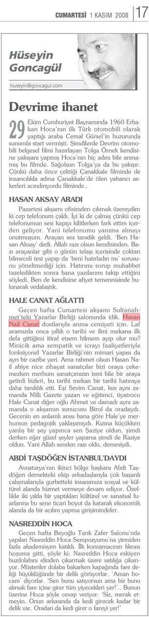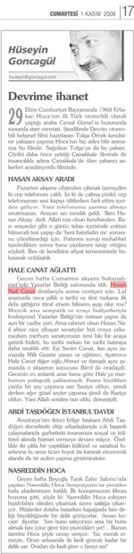 Hüseyin Goncagül / Devrime ihanet Milli Gazete / 01.11.2008 29 Ekim Cumhuriyet Bayramı'nda 1960 Erbakan Hoca’nın ilk Türk otomobili olarak yaptığı araba Cemal Gürsel’in huzurunda sunumla start vermişti. Şimdilerde Devrim otomobili belgesel filmi hazırlayan Tolga Örnek kendisine yakışanı yapmış Hoca’nın hiç adını bile anmamış bu filmde. Sağolsun Tolga’ya da bu yakışır. Çünkü daha önce çektiği Çanakkale filminde de insancılıkla adına Çanakkale’de ölen yabancı askerleri acındırıyordu filminde... HASAN AKSAY ARADI Pazartesi akşamı ofisimden çıkmak üzereydim ki cep telefonum çaldı. İyi ki de çalmış çünkü cep telefonumun sesi kapıyı kilitlerken fark ettim içerden geliyor. Yani telefonumu yanıma almayı unutmuşum. Arayan ses tanıdık geldi. ‘Ben Hasan Aksay’ dedi. Allah razı olsun kendisinden. Bazı arayanlar gibi o günün telaşı içerisinde çoktan bilmeceli test yapıp da ‘beni hatırladın mı’ sorusunu yöneltmediği için. Hatırımı sorup muhabbet tazeledikten sonra bana yazılarımı takip ettiğini söyledi. Ben de kendisine afiyet temennisinde bulunarak vedalaştık. HALE CANAT AĞLATTI Geçen hafta Cumartesi akşamı Sultanahmet’teki Yazarlar Birliği salonunda idik. Hasan Nail Canat dostlarıyla anma cemiyeti için. Laf aramızda onca yıllık o tarihi ve ilmi mekana ilk defa gittiğimi itiraf etsem bilmem ayıp olur mu? Minicik ama sempatik ve icrayı faaliyetleriyle fonksiyonel Yazarlar Birliği’nin mimari yapısı da ayrı bir cazibe yeri. Ama rahmet olsun Hasan Nail abiye nice zihayat sanatçılar bizi oraya çekemezken merhum sanatçımızın ismi bile bir araya getirdi bizleri, bu tarihi mekan bir tarihi hatıraya daha tanıklık etti. Eşi Sevim Canat, kızı aynı zamanda Milli Gazete yazarı ve eğitimci, tiyatrocu Hale Canat diğer oğlu Ahmet ve damadı aynı zamanda o akşamın sunucusu Birol da oradaydı. Gecenin en anlamlı anısı bana göre Hale’ye merhumun pedagojik yaklaşımıydı. Kızına küçükken yanlış bir şey yapınca sen Şaziye oldun, şimdi derken eğer güzel şeyler yaparsa şimdi de Raziye oldun. Yani Allah senden razı oldu, demesiydi. ABDİ TAŞDÖĞEN İSTANBUL’DAYDI Avusturya’nın ikinci bölge başkanı Abdi Taşdöğen dernekteki ekip arkadaşlarıyla çok başarılı çalışmalarıyla gurbetteki insanımıza sosyal ve kültürel alanda hizmet vermeye devam ediyor. Özellikle iki yılda bir yaptıkları kültürel ve sanatsal fuarlarına bu sene ticari boyut da katarak ekonomik alanda da bir açılım yapma girişimindeler. NASREDDİN HOCA Geçen hafta Beyoğlu Tarık Zafer Salonu’nda yapılan Nasreddin Hoca Sempozyumu’na yirmiden fazla akademisyen katıldı. İlk konuşmacının fıkrası hoşuma gitti, şöyle ki: Nasreddin Hoca eskiyen buzdolabını elinden çıkarmak üzere satılığa çıkarıyor. Müşteriler dolaba bakarken kapağında fare deliği büyüklüğünde bir delik görüyorlar. ‘Aman hocam’ diyorlar. ‘Sen bunu satıyorsun ama biz bunu alırsak fare içine girer tüm yiyecekleri yer!’.. Bunun üzerine Hoca şöyle cevap veriyor: ‘Siz, merak etmeyin. Onun arkasında da kedi girecek kadar bir delik var. Oradan da kedi girer o fareyi yer!’ |