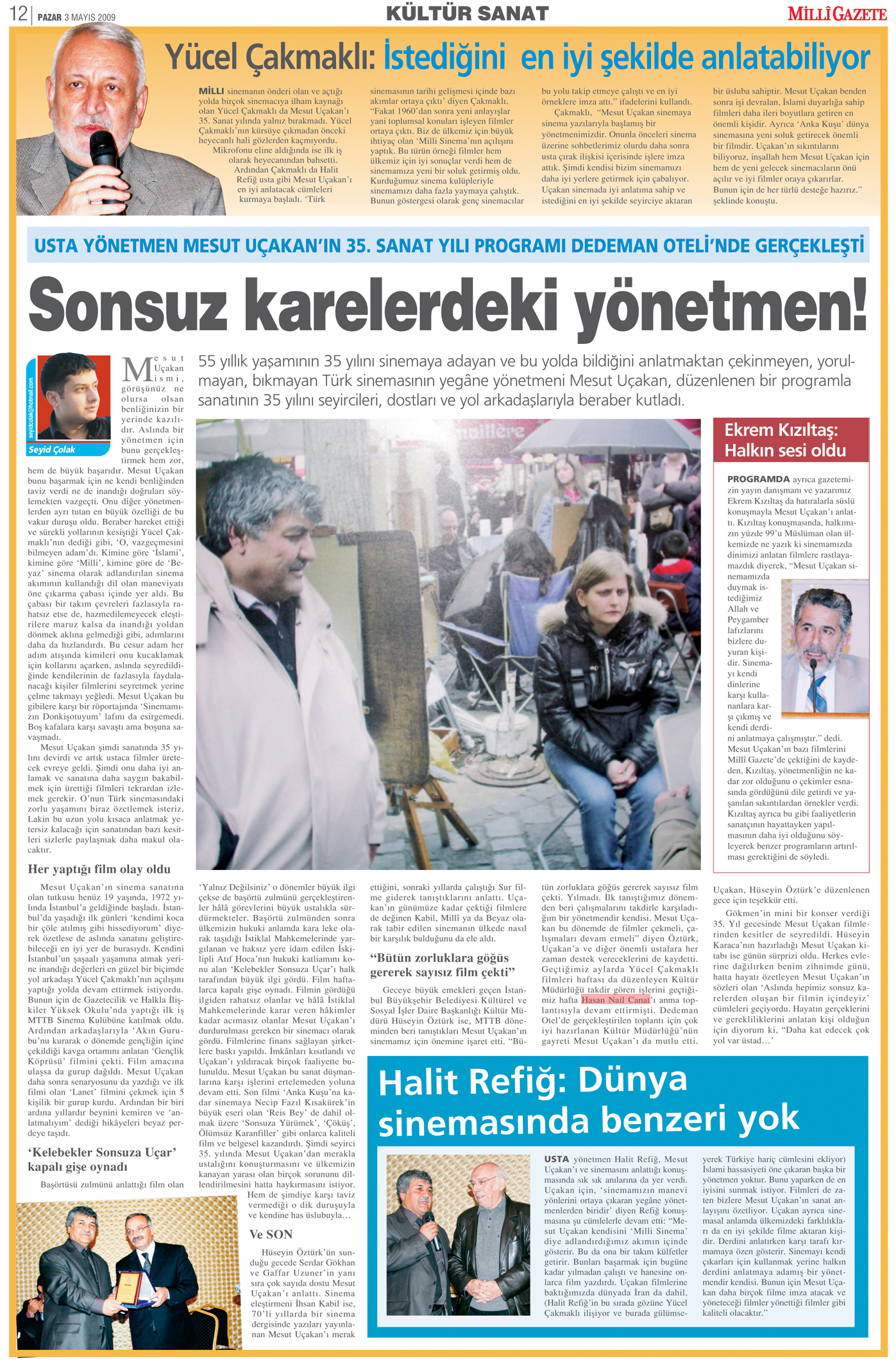 Sonsuz karelerdeki yönetmen! Milli Gazete / 03.05.2009 Usta yönetmen Mesut Uçakan'ın 35. Sanat Yılı Programı Dedeman Oteli'nde gerçekleşti. 55 yıllık yaşamının 35 yılını sinemaya adayan ve bu yolda bildiğini anlatmaktan çekinmeyen, yorulmayan, bıkmayan Türk sinemasının yegâne yönetmeni Mesut Uçakan, düzenlenen bir programla sanatının 35 yılını seyircileri, dostları ve yol arkadaşlarıyla beraber kutladı. Seyid Çolak Mesut Uçakan ismi, görüşünüz ne olursa olsan benliğinizin bir yerinde kazılıdır. Aslında bir yönetmen için bunu gerçekleştirmek hem zor, hem de büyük başarıdır. Mesut Uçakan bunu başarmak için ne kendi benliğinden taviz verdi ne de inandığı doğruları söylemekten vazgeçti. Onu diğer yönetmenlerden ayrı tutan en büyük özelliği de bu vakur duruşu oldu. Beraber hareket ettiği ve sürekli yollarının kesiştiği Yücel Çakmaklı'nın dediği gibi, 'O, vazgeçmesini bilmeyen adam'dı. Kimine göre 'İslami', kimine göre 'Milli', kimine göre de 'Beyaz' sinema olarak adlandırılan sinema akımının kullandığı dil olan maneviyatı öne çıkarma çabası içinde yer aldı. Bu çabası bir takım çevreleri fazlasıyla rahatsız etse de, hazmedilemeyecek eleştirilere maruz kalsa da inandığı yoldan dönmek aklına gelmediği gibi, adımlarını daha da hızlandırdı. Bu cesur adam her adım atışında kimileri onu kucaklamak için kollarını açarken, aslında seyredildiğinde kendilerinin de fazlasıyla faydalanacağı kişiler filmlerini seyretmek yerine çelme takmayı yeğledi. Mesut Uçakan bu gibilere karşı bir röportajında 'Sinemamızın Donkişotuyum' lafını da esirgemedi. Boş kafalara karşı savaştı ama boşuna savaşmadı. Mesut Uçakan şimdi sanatında 35 yılını devirdi ve artık ustaca filmler üretecek evreye geldi. Şimdi onu daha iyi anlamak ve sanatına daha saygın bakabilmek için ürettiği filmleri tekrardan izlemek gerekir. O'nun Türk sinemasındaki zorlu yaşamını biraz özetlemek isteriz. Lakin bu uzun yolu kısaca anlatmak yetersiz kalacağı için sanatından bazı kesitleri sizlerle paylaşmak daha makul olacaktır. Her yaptığı film olay oldu Mesut Uçakan'ın sinema sanatına olan tutkusu henüz 19 yaşında, 1972 yılında İstanbul'a geldiğinde başladı. İstanbul'da yaşadığı ilk günleri 'kendimi koca bir çöle atılmış gibi hissediyorum' diyerek özetlese de aslında sanatını geliştirebileceği en iyi yer de burasıydı. Kendini İstanbul'un şaşaalı yaşamına atmak yerine inandığı değerleri en güzel bir biçimde yol arkadaşı Yücel Çakmaklı'nın açılışını yaptığı yolda devam ettirmek istiyordu. Bunun için de Gazetecilik ve Halkla İlişkiler Yüksek Okulu'nda yaptığı ilk iş MTTB Sinema Kulübüne katılmak oldu. Ardından arkadaşlarıyla 'Akın Gurubu'nu kurarak o dönemde gençliğin içine çekildiği kavga ortamını anlatan 'Gençlik Köprüsü' filmini çekti. Film amacına ulaşsa da gurup dağıldı. Mesut Uçakan daha sonra senaryosunu da yazdığı ve ilk filmi olan 'Lanet' filmini çekmek için 5 kişilik bir gurup kurdu. Ardından bir biri ardına yıllardır beynini kemiren ve 'anlatmalıyım' dediği hikâyeleri beyaz perdeye taşıdı. 'Kelebekler Sonsuza Uçar' kapalı gişe oynadı Başörtüsü zulmünü anlattığı film olan 'Yalnız Değilsiniz' o dönemler büyük ilgi çekse de başörtü zulmünü gerçekleştirenler hâlâ görevlerini büyük ustalıkla sürdürmekteler. Başörtü zulmünden sonra ülkemizin hukuki anlamda kara leke olarak taşıdığı İstiklal Mahkemelerinde yargılanan ve haksız yere idam edilen İskilipli Atıf Hoca'nın hukuki katliamını konu alan 'Kelebekler Sonsuza Uçar'ı halk tarafından büyük ilgi gördü. Film haftalarca kapalı gişe oynadı. Filmin gördüğü ilgiden rahatsız olanlar ve hâlâ İstiklal Mahkemelerinde karar veren hâkimler kadar acımasız olanlar Mesut Uçakan'ı durdurulması gereken bir sinemacı olarak gördü. Filmlerine finans sağlayan şirketlere baskı yapıldı. İmkânları kısıtlandı ve Uçakan'ı yıldıracak birçok faaliyette bulunuldu. Mesut Uçakan bu sanat düşmanlarına karşı işlerini ertelemeden yoluna devam etti. Son filmi 'Anka Kuşu'na kadar sinemaya Necip Fazıl Kısakürek'in büyük eseri olan 'Reis Bey' de dahil olmak üzere 'Sonsuza Yürümek', 'Çöküş', Ölümsüz Karanfiller' gibi onlarca kaliteli film ve belgesel kazandırdı. Şimdi seyirci 35. yılında Mesut Uçakan'dan merakla ustalığını konuşturmasını ve ülkemizin kanayan yarası olan birçok sorununu dillendirilmesini hatta haykırmasını istiyor. Hem de şimdiye karşı taviz vermediği o dik duruşuyla ve kendine has üslubuyla... Ve SON Hüseyin Öztürk'ün sunduğu gecede Serdar Gökhan ve Gaffar Uzuner'in yanı sıra çok sayıda dostu Mesut Uçakan'ı anlattı. Sinema eleştirmeni İhsan Kabil ise, 70'li yıllarda bir sinema dergisinde yazıları yayınlanan Mesut Uçakan'ı merak ettiğini, sonraki yıllarda çalıştığı Sur filme giderek tanıştıklarını anlattı. Uçakan'ın günümüze kadar çektiği filmlere de değinen Kabil, Millî ya da Beyaz olarak tabir edilen sinemanın ülkede nasıl bir karşılık bulduğunu da ele aldı. "Bütün zorluklara göğüs gererek sayısız film çekti" Geceye büyük emekleri geçen İstanbul Büyükşehir Belediyesi Kültürel ve Sosyal İşler Daire Başkanlığı Kültür Müdürü Hüseyin Öztürk ise, MTTB döneminden beri tanıştıkları Mesut Uçakan'ın sinemamız için önemine işaret etti. "Bütün zorluklara göğüs gererek sayısız film çekti. Yılmadı. İlk tanıştığımız dönemden beri çalışmalarını takdirle karşıladığım bir yönetmendir kendisi. Mesut Uçakan bu dönemde de filmler çekmeli, çalışmaları devam etmeli" diyen Öztürk, Uçakan'a ve diğer önemli ustalara her zaman destek vereceklerini de kaydetti. Geçtiğimiz a