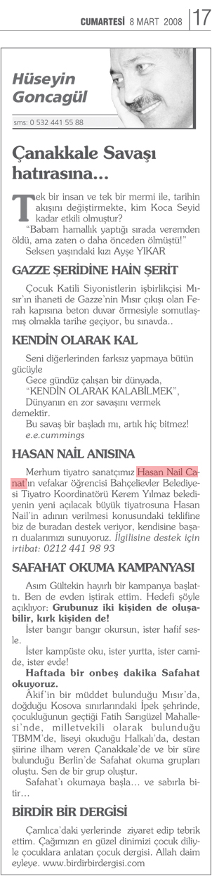 Merhum tiyatro sanatçımız Hasan Nail Canat"ın vefakar öğrencisi Bahçelievler Belediyesi Tiyatro Koordinatörü Kerem Yılmaz belediyenin yeni açılacak büyük tiyatrosuna Hasan Nail"in adının verilmesi konusundaki teklifine biz de buradan destek veriyor, kendisine başarı dualarımızı sunuyoruz. İlgilisine destek için irtibat: 0212 441 98 93