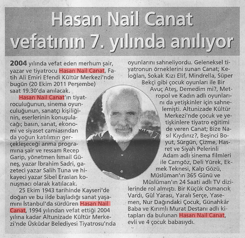 Hasan Nail Canat'ın tiyatroculuğunun, sinema oyunculuğunun, sanatçı kişiliğinin, eserlerinin konuşulacağı; basın, sanat, ekonomi ve siyaset camiasından da yoğun katılımın gerçekleşeceği anma programına şair ve ressam Recep Garip, yönetmen İsmail Güneş, yazar İbrahim Sadri, gazeteci yazar Salih Tuna ve hikayeci yazar Sibel Eraslan konuşmacı olarak katılacak.