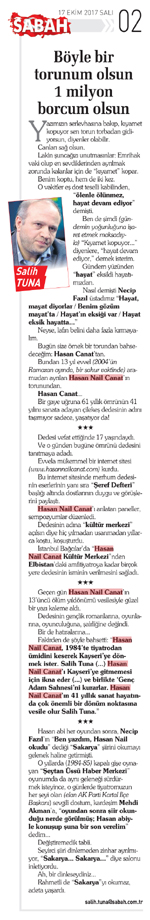 Salih Tuna / Böyle bir torunum olsun 1 milyon borcum olsun Sabah Gazetesi / 17.10.2017 Yazımızın serlevhasına bakıp, kıyamet kopuyor sen torun torbadan gidiyorsun, diyenler olabilir. Canları sağ olsun. Lakin şuncağızı unutmasınlar: Emrihak vaki olup en sevdiklerinden ayrılmak zorunda kalanlar için de "kıyamet" kopar. Benim koptu, hem de iki kez. O vakitler eş dost teselli kabilinden, "ölenle ölünmez, hayat devam ediyor" demişti. Ben de şimdi (gündemin yoğunluğuna işaret etmek maksadıyla) "Kıyamet kopuyor..." diyenlere, "hayat devam ediyor," demek isterim. Gündem yüzünden "hayat" eksildi hayatımızdan. Nasıl demişti Necip Fazıl üstadımız "Hayat, mayat diyorlar / Benim gözüm mayat'ta / Hayat'ın eksiği var / Hayat eksik hayatta..." Neyse, lafın belini daha fazla kırmayalım. Bugün size örnek bir torundan bahsedeceğim: Hasan Canat'tan. Bundan 13 yıl evvel (2004'ün Ramazan ayında, bir sahur vaktinde) aramızdan ayrılan Hasan Nail Canat'ın torunundan. Hasan Canat... Bir gaye uğruna 61 yıllık ömrünün 41 yılını sanata adayan çilekeş dedesinin adını taşımıyor sadece, yaşatıyor da! Dedesi vefat ettiğinde 17 yaşındaydı. Ve o günden bugüne ömrünü dedesini tanıtmaya adadı. Evvela mükemmel bir internet sitesi (www.hasannailcanat.com) kurdu. Bu internet sitesinde merhum dedesinin eserlerinin yanı sıra "Şeref Defteri" başlığı altında dostlarının duygu ve görüşlerini paylaştı. Hasan Nail Canat'ı anlatan paneller, sempozyumlar düzenledi. Dedesinin adına "kültür merkezi" açılsın diye hiç yılmadan usanmadan yıllarca koştu, koşuşturdu. İstanbul Bağcılar'da "Hasan Nail Canat Kültür Merkezi"nden Elbistan'daki amfitiyatroya kadar birçok yere dedesinin isminin verilmesini sağladı. Geçen gün Hasan Nail Canat'ın 13'üncü ölüm yıldönümü vesilesiyle güzel bir yazı kaleme aldı. Dedesinin gençlik romanlarına, oyunlarına, oyunculuğuna, şairliğine değindi. Bir de hatıralarına... Fakirden de şöyle bahsetti: "Hasan Nail Canat, 1984'te tiyatrodan ümidini keserek Kayseri'ye dönmek ister. Salih Tuna (...) Hasan Nail Canat'ı Kayseri'ye gitmemesi için ikna eder (...) ve birlikte 'Genç Adam Sahnesi'ni kurarlar. Hasan Nail Canat'ın 41 yıllık sanat hayatında çok önemli bir dönüm noktasına vesile olur Salih Tuna." Hasan abi her oyundan sonra, Necip Fazıl'ın "Ben yazdım, Hasan Nail okudu" dediği "Sakarya" şiirini okumayı gelenek haline getirmişti. O yıllarda (1984-85) kapalı gişe oynayan "Şeytan Üssü Haber Merkezi" oyunumda da aynı geleneği sürdürmek isteyince, o günlerde tiyatromuzun her şeyi olan (elan AK Parti Kartal İlçe Başkanı) sevgili dostum, kardeşim Mehdi Akman'a, "oyundan sonra şiir okunduğu nerde görülmüş; Hasan abiyle konuşup şuna bir son verelim" dedim... Değiştiremedik tabii. Seyirci şiiri dinlemeden zinhar ayrılmıyor, "Sakarya... Sakarya..." diye salonu inletiyordu. Ah, bir dinleseydiniz... Rahmetli de "Sakarya"yı okumaz, adeta yaşardı. |
