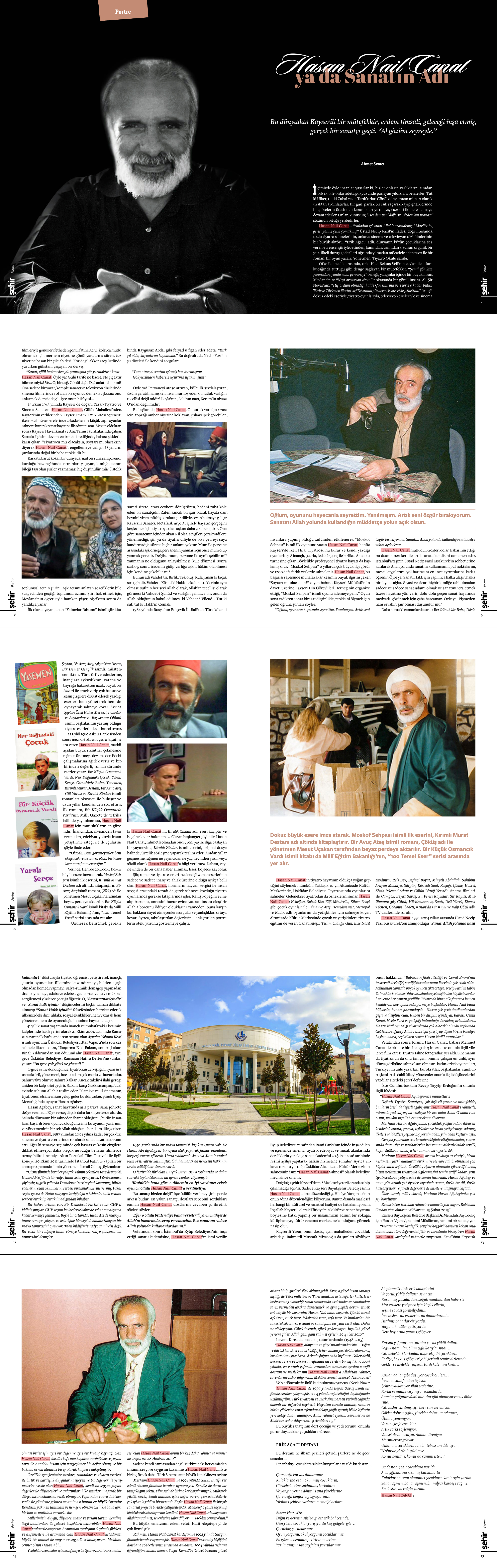 Ahmet Sıvacı / Hasan Nail Canat ya da Sanatın Adı Şehir Dergisi / 01.05.2021 Bu dünyadan Kayserili bir mütefekkir, erdem timsali, geleceği inşa etmiş, gerçek bir sanatçı geçti. "Al gözüm seyreyle." İçimizde öyle insanlar yaşarlar ki, bizler onların varlıklarını sıradan bilsek bile onlar adeta gökyüzünde parlayan yıldızlara benzerler. Tut ki Ülker, tut ki Zuhal ya da Tarık'tırlar. Gönül dünyamızın mimarı olarak uzaktan aydınlatırlar. Bir gün, parlak bir ışık saçarak kayıp gittiklerinde bile, ötelerin ötesinden karanlıkları yırtmaya, eserleri ile nefes almaya devam ederler. Onlar, Yunus'un; "Her dem yeni doğarız. Bizden kim usanası" sözünün bittiği yerdedirler. Hasan Nail Canat... "Anladım işi sanat Allah'ı aramakmış / Marifet bu, gerisi yalnız çelik çomakmış" Üstad Necip Fazıl'ın ifadesi doğrultusunda, tozlu tiyatro sahnelerinin, onlarca sinema ve televizyon dizi filmlerinin bir büyük aktörü. "Erik Ağacı" adlı, dünyanın bütün çocuklarına ses veren evrensel şiiriyle, etinden, kanından, canından sızdıran organik bir şair. İlkeli duruşu, idealleri uğrunda yılmadan mücadele eden tavrı ile bir roman, bir oyun yazarı. Yönetmen. Tiyatro Okulu sahibi. Öfke ile incelik arasında, tıpkı Hacı Bektaş Veli'nin ceylan ile aslanı kucağında tuttuğu gibi denge sağlayan bir mütefekkir. "Şem'i gör kim yanmadan, yandırmadı pervaneyi" örneği, yangınlar içinde bir büyük insan. Mevlana'nın: "Neyi arıyorsan o'sun" noktasında bir gönül insanı. Ali Şir Nevai'nin: "Hiç ordum olmadığı halde Çin sınırına ve Tebriz'e kadar bütün Türk ve Türkmen illerini sırf Divanımı göndermek suretiyle fethettim." örneği dokuz edebî eseriyle, tiyatro oyunlarıyla, televizyon dizileriyle ve sinema filmleriyle gönülleri fetheden gönül fatihi. Acıyı, kolayca mutlu olmamak için merhem niyetine gönül yaralarına süren, tuz niyetine basan bir çile abidesi. Kor değil akkor ateş üstünde yürürken gülistanı yaşayan bir derviş. "Sanat, gülü incitmeden gül yaprağına şiir yazmaktır." İmza; Hasan Nail Canat. Öyle ya! Gülü tarife ne hacet. Ne çiçektir bilmez miyiz? Ve... O, bir dağ. Gönül dağı. Dağ anlatılabilir mi? Ona sadece bir yazar, komple sanatçı ve televizyon dizilerinde, sinema filmlerinde rol alan bir oyuncu demek kuşkusuz onu anlatmak demek değil. İşte onun hikâyesi... 25 Ekim 1943 yılında Kayseri'de doğan, Yazar-Tiyatro ve Sinema Sanatçısı Hasan Nail Canat, Gülük Mahallesi'nden. Kayseri'nin yerlilerinden. Kayseri İmam Hatip Lisesi öğrencisi iken okul müsamerelerinde arkadaşları ile küçük çaplı oyunlar sahneye koyarak sanat hayatına ilk adımını atar. Mezun olduktan sonra Kayseri Hava İkmal ve Ana Tamir fabrikalarında çalışır. Sanatla ilgisini devam ettirmek istediğinde, babası şiddetle karşı çıkar. "Tiyatrocu mu olacaksın, soytarı mı olacaksın" diyerek Hasan Nail Canat'ı engellemeye çalışır. O yılların şartlarında doğal bir baba tepkisidir bu. Kaskatı, barut kokan bir dünyada, naif bir ruha sahip, kendi kurduğu hazangâhında ıstırapları yaşayan, kimliği, acının bileği taşı olan şiirler yazmaması hiç düşünülür mü? Üstelik toplumsal acının şiirini. Aşk acısını anlatan sözcüklerin bile süzgecinden geçtiği toplumsal acının. Şiiri hak etmek için, Mevlana'nın öğretisiyle hamken pişer, piştikten sonra da yandıkça yanar. İlk olarak yayımlanan "Yalnızlar Rıhtımı" isimli şiir kitabında Kaygusuz Abdal gibi feryad u figan eder adeta: "Kırk yıl oldu, kaynatırım kaynamaz." Bu doğrultuda Necip Fazıl'ın şu dizeleri ile kendini sorgular: "Tam otuz yıl saatim işlemiş ben durmuşum Gökyüzünden habersiz uçurtma uçurmuşum" Öyle ya! Pervaneyi ateşe attıran, bülbülü şeydalaştıran, üzüm yaratılmamışken insanı sarhoş eden o mutlak varlığın tecellisi değil midir? Leyla'nın, Aslı'nın nazı, Kerem'in niyazı O'ndan değil midir? Bu bağlamda; Hasan Nail Canat, O mutlak varlığın rızası için, toprağı amber niyetine koklayan, çuhayı ipek görebilen, sureti sirete, arazı cevhere dönüştüren, bedeni ruha köle eden bir sanatçıdır. Zaten sancılı bir şair olarak hayata dair, beynini yiyen müthiş sorulara şiir diliyle cevap bulmaya çalışır Kayserili Sanatçı. Metafizik ürperti içinde hayatın gerçeğini keşfetmek için tiyatroya olan aşkını daha çok pekiştirir. Ona göre sanatçının içinden akan Nil olsa, sevgileri çorak vadilere yönelmediği, şiir ya da tiyatro diliyle de olsa çevreyi suya kandırmadığı sürece hiçbir anlamı yoktur. Mum ile pervane arasındaki aşk örneği, pervanenin yanması için önce mum olup yanmak gerekir. Değilse mum, pervane ile aynileşebilir mi? Yanmanın ne olduğunu anlayabilmesi, küle dönmesi, sonra sarhoş, sonra iradenin gidip varlığa aşkın hâkim olabilmesi için kendine çekebilir mi? Bunun adı Vahdet'tir. Birlik. Tek oluş. Kula yansır ki bıçak sırtı gibidir. Vahdet-i Küsud ki Hakk ile kulun isteklerinin aynı olması; sufinin her şeyi Allah olarak, Allah'ın tecellisi olarak görmesi ki Vahdet-i Şuhûd ve varlığın yalnızca bir, onun da Allah olduğunun kabul edilmesi ki Vahdet-i Vücud... Tut ki sufi tut ki Hakk'ın Cemali. 1964 yılında Rusya'nın Bolşevik İhtilali'nde Türk kökenli insanlara yapmış olduğu zulümden etkilenerek "Moskof Sehpası" isimli ilk oyununu yazan Hasan Nail Canat, henüz Kayseri'de iken Hilal Tiyatrosu'nu kurar ve kendi yazdığı oyunlarla, 7-8 inançlı, şuurlu, fedakâr genç ile birlikte Anadolu turnesine çıkar. Böylelikle profesyonel tiyatro hayatı da başlamış olur. "Moskof Sehpası" o yıllarda çok büyük ilgi görür ve 1200 defa farklı yerlerde sahnelenir. Hasan Nail Canat, bu başarısı sayesinde muhafazakâr kesimin büyük ilgisini çeker. "Soytarı mı olacaksın?" diyen babası,