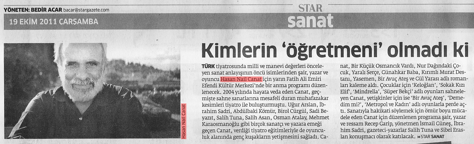 Türk tiyatrosunda milli ve manevi değerleri önceleyen sanat anlayışının öncü isimlerinden şair, yazar ve oyuncu Hasan Nail Canat için yarın Fatih Ali Emiri Efendi Kültür Merkezi'nde bir anma programı düzenlenecek.