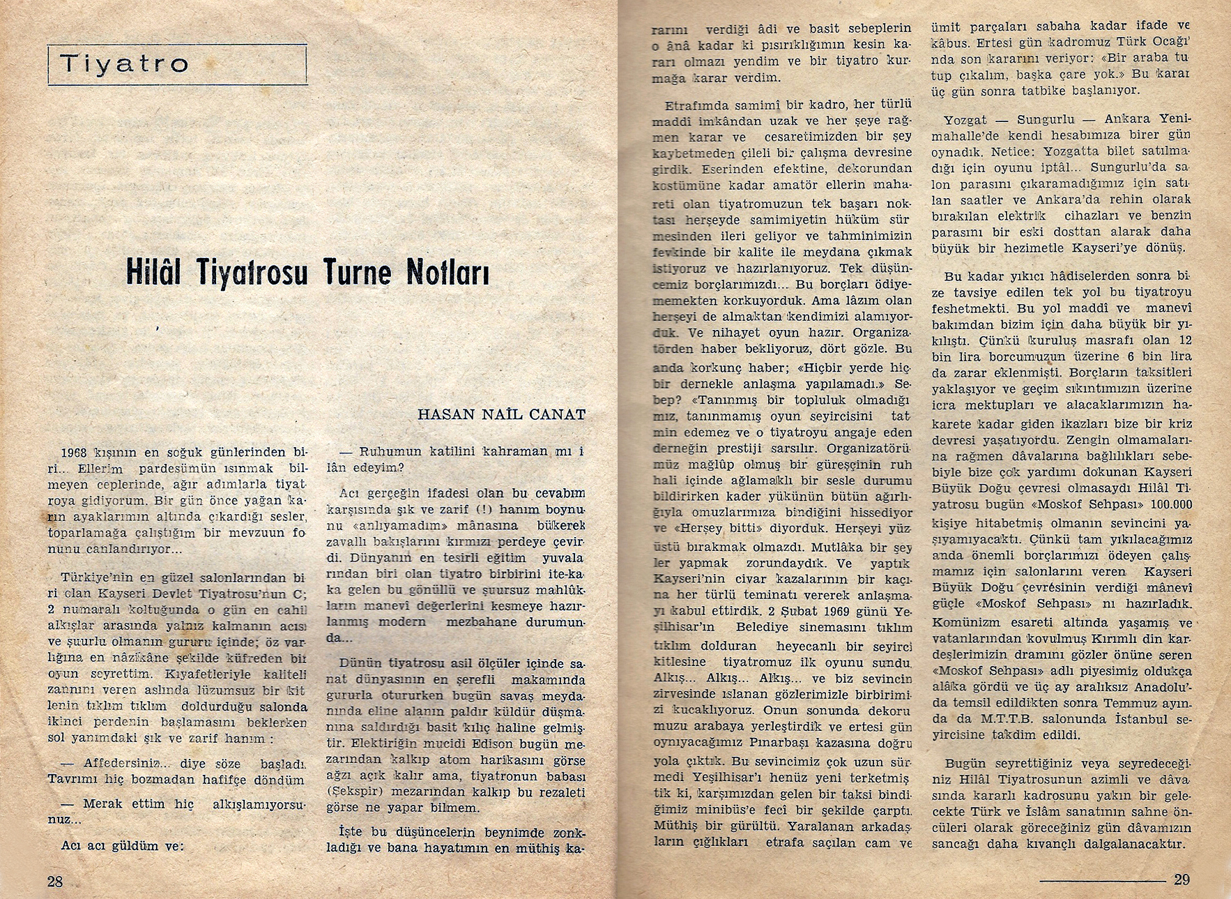 Hasan Nail Canat / Hilal Tiyatrosu Turne Notları Tohum Dergisi / 01.10.1969 1968 kışının en soğuk günlerinden biri... Ellerim pardesümün ısınmak bilmeyen ceplerinde, ağır adımlarla tiyatroya gidiyorum. Bir gün önce yağan karın ayaklarımın altında çıkardığı sesler, toparlamaya çalıştığım bir mevzunun fonunu canlandırıyor. Türkiye'nin en güzel salonlarından biri olan Kayseri Devlet Tiyatrosu'nun C-2 numaralı koltuğunda o gün en cahil alkışlar arasında yalnız kalmanın acısı ve şuurlu olmanın gururu içinde; öz varlığına en nâzikâne şekilde küfreden bir oyun seyrettim. Kıyafetleriyle kaliteli zannını veren aslında lüzumsuz bir kitlenin tıklım tıklım doldurduğu salonda ikinci perdenin başlamasını beklerken sol yanımdaki şık ve zarif hanım: - Afedersiniz, diye söze başladı. Tavrımı hiç bozmadan hafifçe döndüm. - Merak ettim hiç alkışlamıyorsunuz. Acı acı güldüm ve; - Ruhumun katilini kahraman mı ilan edeyim? Acı gerçeğin ifadesi olan bu cevabım karşısında şık ve zarif (!) hanım boynunu "anlayamadım" mânâsına bükerek zavallı bakışlarını kırmızı perdeye çevirdi. Dünyanın en tesirli eğitim yuvalarından biri olan tiyatro birbirini ite-kaka gelen bu gönüllü ve şuursuz mahlukların manevi değerlerini kesmeye hazırlanmış modern mezbahâne durumunda... Dünün tiyatrosu asil ölçüler içinde sanat dünyasının en şerefli makamında gururla otururken bugün savaş meydanında eline alanın paldır küldür düşmanına saldırdığı basit kılıç haline gelmiştir. Elektriğin mucidi Edison bugün mezarından kalkıp atom harikasını görse ağzı açık kalır ama, tiyatronun babası ( Sheakespeare ) mezarından kalkıp bu rezaleti görse ne yapar bilmem. İşte bu düşüncelerin beynimde zonkladığı ve bana hayatımın en müthiş kararını verdiği âdi ve basit sebeplerin o ânâ kadarki pısırıklığımın kesin kararı olmazı yendim ve bir tiyatro kurmaya karar verdim. Etrafımda samimi bir kadro, her türlü maddi imkandan uzak ve her şeye rağmen karar ve cesaretimizden bir şey kaybetmeden çileli bir çalışma devresine girdik. Eserinden efektine, dekorundan kostümüne kadar amatör ellerin mahareti olan tiyatromuzun tek başarı noktası her şeyde samimiyetin hüküm sürmesinden ileri geliyor ve tahminimizin fevkinde bir kalite ile meydana çıkmak istiyoruz ve hazırlanıyoruz. Tek düşüncemiz borçlarımızdı... Bu borçları ödeyememekten korkuyorduk. Ama lazım olan her şeyi de almaktan kendimizi alamıyorduk. Ve nihayet oyun hazır. Organizatörden haber bekliyoruz, dört gözle. Bu anda korkunç haber; "Hiçbir yerde hiçbir dernekle anlaşma yapılamadı". Sebep? "Tanınmış bir topluluk olmadığımız, tanınmamış oyun seyircisini tatmin edemez ve o tiyatroyu angaje eden derneğin prestiji sarsılır". Organizatörümüz mağlup olmuş bir güreşçinin ruh hali içinde ağlamaklı bir sesle durumu bildirirken kader yükünün bütün ağırlığıyla omuzlarımıza bindiğini hissediyor ve "Her şey bitti" diyorduk. Her şeyi yüzüstü bırakmak olmazdı. Mutlaka bir şeyler yapmak zorundaydık. Ve yaptık. Kayseri'nin civar kazalarının bir kaçına her türlü teminatı vererek anlaşmayı kabul ettirdik. 2 Şubat 1969 günü Yeşilhisar'ın belediye sinemasını tıklım tıklım dolduran heyecanlı bir seyirci kitlesine tiyatromuz ilk oyunu sundu. Alkış... Alkış... Alkış... Ve biz sevincin zirvesinde ıslanan gözlerimizle birbirimizi kucaklıyoruz. Oyunun sonunda dekorumuzu arabaya yerleştirdik ve ertesi gün oynayacağımız Pınarbaşı kazasına doğru yola çıktık. Bu sevincimiz çok uzun sürmedi. Yeşilhisar'ı henüz yeni terketmiştik ki, karşımızdan gelen bir taksi bindiğimiz minibüse feci bir şekilde çarptı. Müthiş bir gürültü. Yaralanan arkadaşların çığlıkları, etrafa saçılan cam ve ümit parçaları, sabaha kadar ifade ve kâbus. Ertesi gün kadromuz Türk Ocağı'nda son kararını veriyor: "Bir araba tutup çıkalım, başka çare yok". Bu karar 3 gün sonra tatbike başlanıyor. Yozgat-Sungurlu-Ankara Yenimahalle'de kendi hesabımıza birer gün oynadık. Netice: Yozgat'ta bilet satılmadığı için oyunu iptal... Sungurlu'da salon parasını çıkaramadığımız için satılan saatler ve Ankara'da rehin olarak bırakılan elektrik cihazları ve benzin parasını bir eski dosttan alarak daha büyük bir hezimetle Kayseri'ye dönüş. Bu kadar yıkıcı hadiselerden sonra bize tavsiye edilen tek yol bu tiyatroyu feshetmekti. Bu yol maddi ve manevi bakımdan bizim için daha büyük bir yıkılıştı. Çünkü kuruluş masrafı olan 12 bin lira borcumuzun üzerine 6 bin lira da zarar eklenmişti. Borçların taksitleri yaklaşıyor ve geçim sıkıntımızın üzerine icra mektupları ve alacaklarımızın hakarete kadar giden ikazları bize bir kriz devresi yaşatıyordu. Zengin olmamalarına rağmen davalarına bağlılıkları sebebiyle bize çok yardımı dokunan Kayseri Büyük Doğu Çevresi olmasaydı Hilal Tiyatrosu bugün "Moskof Sehpası" 100.000 kişiye hitap etmiş olmanın sevincini yaşamayacaktı. Çünkü tam yıkılacağımız anda önemli borçlarımızı ödeyen, çalışmamız için salonlarını veren Kayseri Büyük Doğu Çevresi'nin verdiği manevi güçle Moskof Sehpası'nı hazırladık. Komünizm esareti altında yaşamış ve vatanlarından kovulmuş Kırımlı din kardeşlerimizin dramını gözler önüne seren "Moskof Sehpası" adlı piyesimiz oldukça alâka gördü ve 3 ay aralıksız Anadolu'da temsil edildikten sonra Temmuz ayında da MTTB salonunda İstanbul seyircisine takdim edildi. Bugün seyrettiğiniz veya seyredeceğiniz Hilal Tiyatrosu'nun azimli ve davasında kararlı kadrosunu yakın bir gelecekte Türk ve İslam sanatının sahne öncüleri olarak göreceğiniz gün davamızın sancağı daha kıvançlı dalgalanacaktır. Kaynak: T
