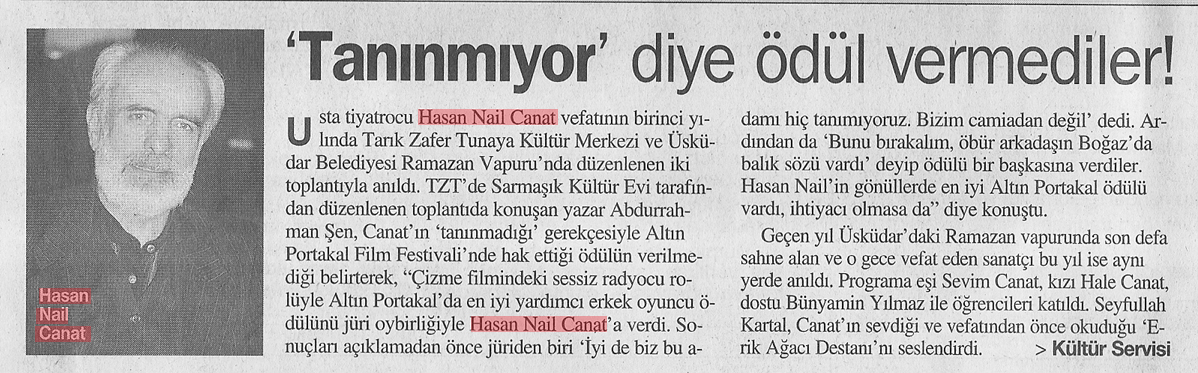 Usta tiyatrocu Hasan Nail Canat vefatının birinci yılında Tarık Zafer Tunaya Kültür Merkezi ve Üsküdar Belediyesi Ramazan Vapuru'nda düzenlenen iki toplantıyla anıldı.