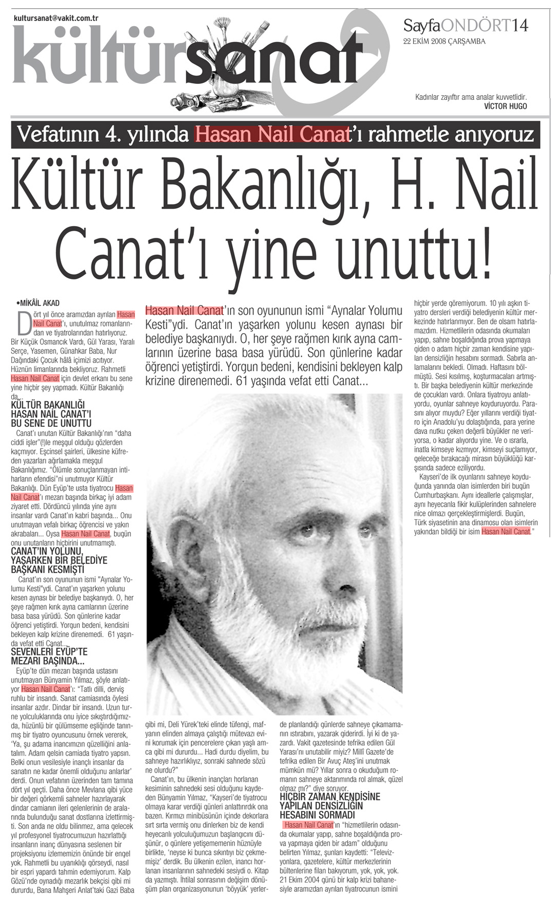 Kültür Bakanlığı, H. Nail Canat'ı yine unuttu! Vakit Gazetesi / 22.10.2008 Hasan Nail Canat'ın son oyununun ismi “Aynalar Yolumu Kesti”ydi. Canat'ın yaşarken yolunu kesen aynası bir belediye başkanıydı. O, her şeye rağmen kırık ayna camlarının üzerine basa basa yürüdü. Son günlerine kadar öğrenci yetiştirdi. Yorgun bedeni, kendisini bekleyen kalp krizine direnemedi. 61 yaşında vefat etti Canat... Dört yıl önce aramızdan ayrılan Hasan Nail Canat'ı, unutulmaz romanlarından ve tiyatrolarından hatırlıyoruz. Bir Küçük Osmancık Vardı, Gül Yarası, Yaralı Serçe, Yasemen, Günahkar Baba, Nur Dağındaki Çocuk hala içimizi acıtıyor. Hüznün limanlarında bekliyoruz. Rahmetli Hasan Nail Canat için devlet erkanı bu sene yine hiçbir şey yapmadı. Kültür Bakanlığı da...
