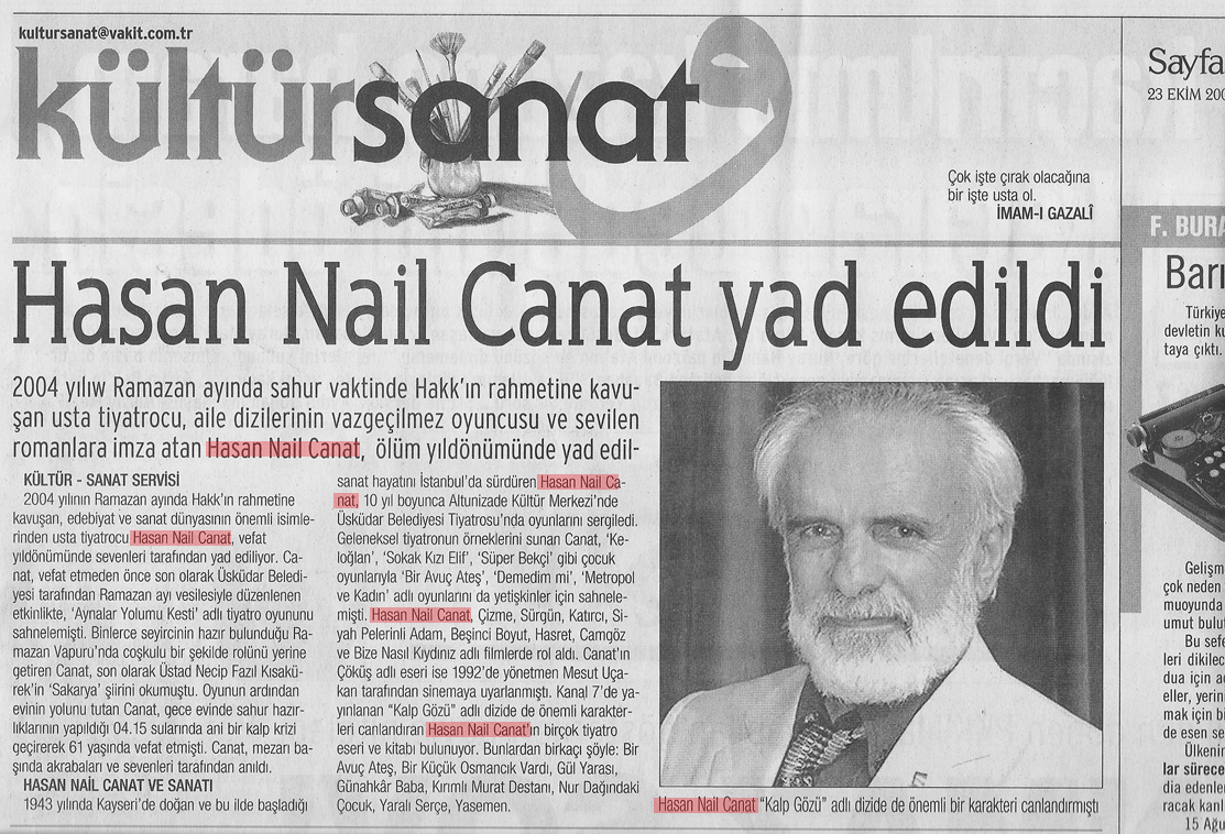 2004 yılı Ramazan ayında sahur vaktinde Hakk’ın rahmetine kavuşan usta tiyatrocu, aile dizilerinin vazgeçilmez oyuncusu ve sevilen romanlara imza atan Hasan Nail Canat, ölüm yıldönümünde yad edildi.