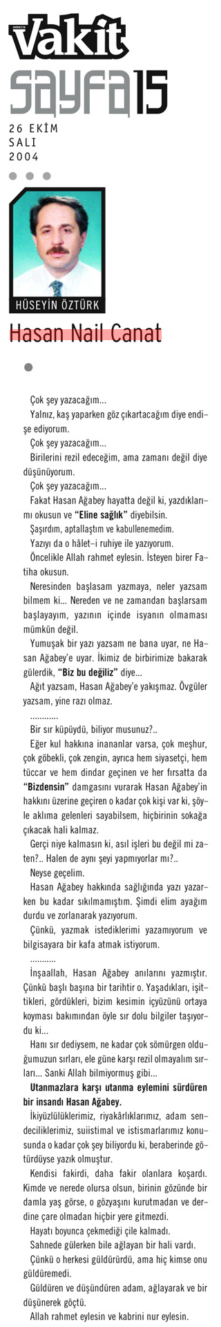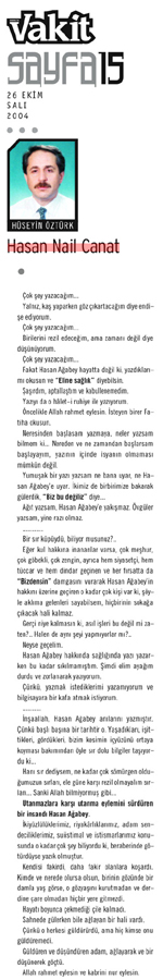 Hüseyin Öztürk / Hasan Nail Canat Vakit Gazetesi / 26.10.2004 Çok şey yazacağım... Yalnız, kaş yaparken göz çıkartacağım diye endişe ediyorum. Çok şey yazacağım... Birilerini rezil edeceğim, ama zamanı değil diye düşünüyorum. Çok şey yazacağım... Fakat Hasan Ağabey hayatta değil ki, yazdıklarımı okusun ve "Eline sağlık" diyebilsin. Şaşırdım, aptallaştım ve kabullenemedim. Yazıyı da o halet-i ruhiye ile yazıyorum. Öncelikle Allah rahmet eylesin. İsteyen birer Fatiha okusun. Neresinden başlasam yazmaya, neler yazsam bilmem ki... Nereden ve ne zamandan başlarsam başlayayım, yazının içinde isyanın olmaması mümkün değil. Yumuşak bir yazı yazsam ne bana uyar, ne Hasan Ağabey'e uyar. İkimiz de birbirimize bakarak gülerdik, "Biz bu değiliz" diye... Ağıt yazsam, Hasan Ağabey'e yakışmaz. Övgüler yazsam, yine razı olmaz. Bir sır küpüydü, biliyor musunuz?.. Eğer kul hakkına inananlar varsa, çok meşhur, çok göbekli, çok zengin, ayrıca hem siyasetçi, hem tüccar ve hem dindar geçinen ve her fırsatta da "Bizdensin" damgasını vurarak Hasan Ağabey'in hakkını üzerine geçiren o kadar çok kişi var ki, şöyle aklıma gelenleri sayabilsem, hiçbirinin sokağa çıkacak hali kalmaz. Gerçi niye kalmasın ki, asıl işleri bu değil mi zaten?.. Halen de aynı şeyleri yapmıyorlar mı?.. Neyse geçelim. Hasan Ağabey hakkında sağlığında yazı yazarken bu kadar sıkılmamıştım. Şimdi elim ayağım durdu ve zorlanarak yazıyorum. Çünkü, yazmak istediklerimi yazamıyorum ve bilgisayara bir kafa atmak istiyorum. İnşaallah, Hasan Ağabey anılarını yazmıştır. Çünkü başlı başına bir tarihtir o. Yaşadıkları, işittikleri, gördükleri, bizim kesimin içyüzünü ortaya koyması bakımından öyle sır dolu bilgiler taşıyordu ki... Hani sır dediysem, ne kadar çok sömürgen olduğumuzun sırları, ele güne karşı rezil olmayalım sırları... Sanki Allah bilmiyormuş gibi... Utanmazlara karşı utanma eylemini sürdüren bir insandı Hasan Ağabey. İkiyüzlülüklerimiz, riyakarlıklarımız, adam sendeciliklerimiz, suistimal ve istismarlarımız konusunda o kadar çok şey biliyordu ki, beraberinde götürdüyse yazık olmuştur. Kendisi fakirdi, daha fakir olanlara koşardı. Kimde ve nerede olursa olsun, birinin gözünde bir damla yaş görse, o gözyaşını kurutmadan ve derdine çare olmadan hiçbir yere gitmezdi. Hayatı boyunca çekmediği çile kalmadı. Sahnede gülerden bile ağlayan bir hali vardı. Çünkü o herkesi güldürürdü, ama hiç kimse onu güldüremedi. Güldüren ve düşündüren adam, ağlayarak ve bir düşünerek göçtü. Allah rahmet eylesin ve kabrini nur eylesin. Kaynak: Vakit Gazetesi |