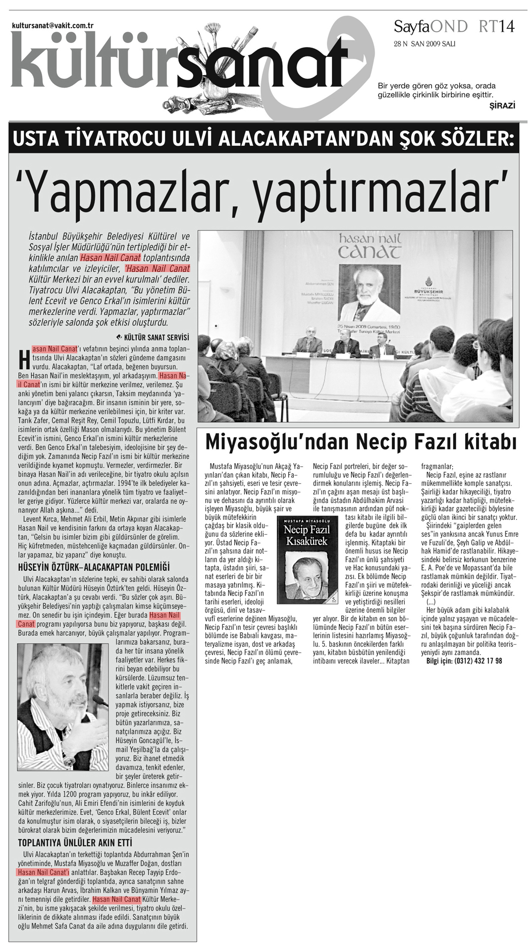 İstanbul Büyükşehir Belediyesi Kültürel ve Sosyal İşler Müdürlüğü'nün tertiplediği bir etkinlikle anılan Hasan Nail Canat toplantısında katılımcılar ve izleyiciler, 'Hasan Nail Canat Kültür Merkezi bir an evvel kurulmalı' dediler. Tiyatrocu Ulvi Alacakaptan, "Bu yönetim Bülent Ecevit ve Genco Erkal'ın isimlerini kültür merkezlerine verdi. Yapmazlar, yaptırmazlar" sözleriyle salonda şok etkisi oluşturdu.