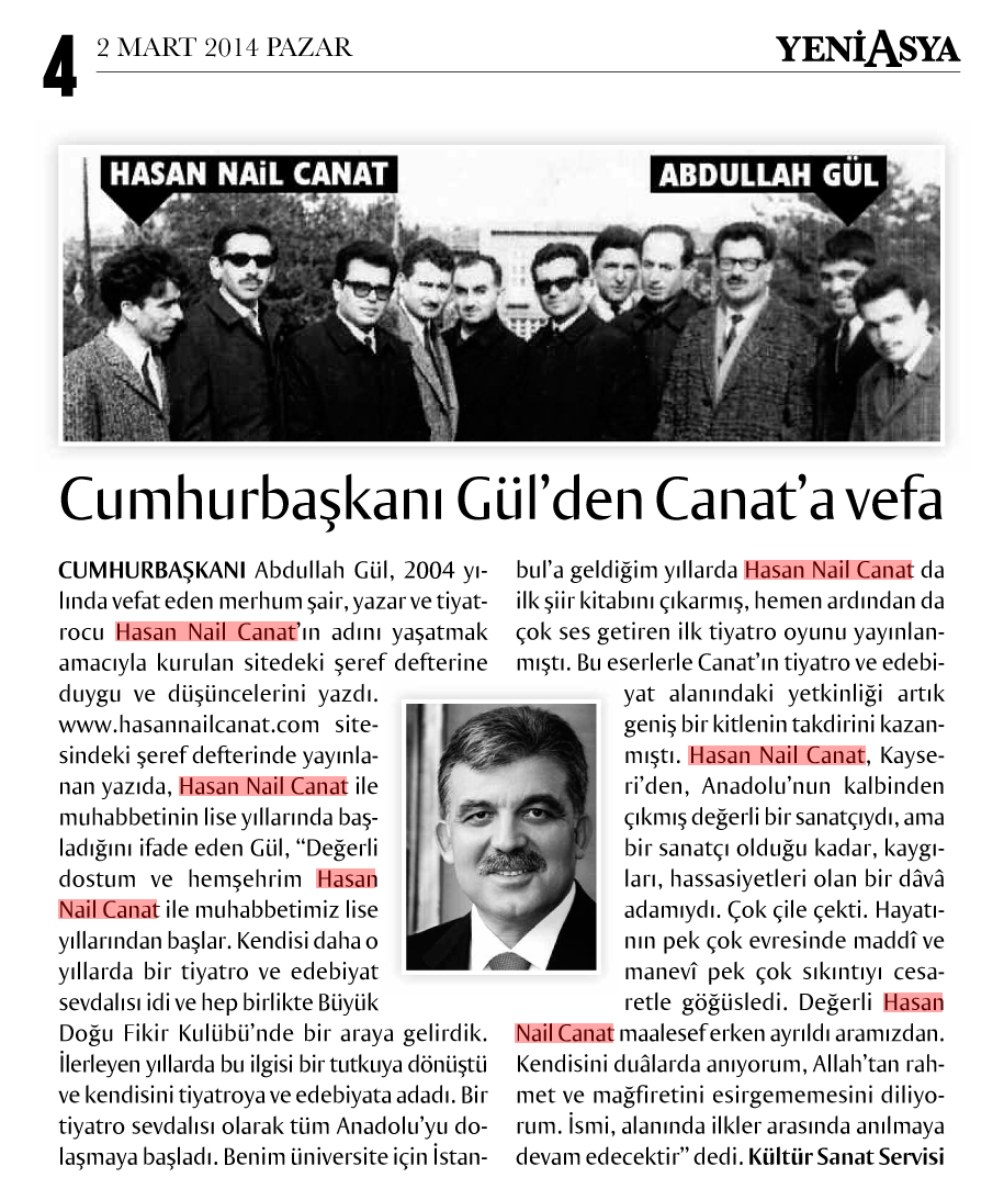 www.hasannailcanat.com sitesindeki Şeref Defteri'nde yayınlanan yazıda, Hasan Nail Canat ile muhabbetinin lise yıllarında başladığını ifade eden Gül, "Değerli dostum ve hemşehrim Hasan Nail Canat ile muhabbetimiz lise yıllarından başlar. Kendisi daha o yıllarda bir tiyatro ve edebiyat sevdalısı idi ve hep birlikte Büyük Doğu Fikir Kulübü'nde bir araya gelirdik. İlerleyen yıllarda bu ilgisi bir tutkuya dönüştü ve kendisini tiyatroya ve edebiyata adadı. Bir tiyatro sevdalısı olarak tüm Anadolu'yu dolaşmaya başladı. Benim üniversite için İstanbul'a geldiğim yıllarda Hasan Nail Canat da ilk şiir kitabını çıkarmış, hemen ardından da çok ses getiren ilk tiyatro oyunu yayınlanmıştı. Bu eserlerle Canat'ın tiyatro ve edebiyat alanındaki yetkinliği artık geniş bir kitlenin takdirini kazanmıştı. Hasan Nail Canat, Kayseri'den, Anadolu'nun kalbinden çıkmış değerli bir sanatçıydı, ama bir sanatçı olduğu kadar, kaygıları, hassasiyetleri olan bir dâvâ adamıydı. Çok çile çekti. Hayatının pek çok evresinde maddî ve manevî pek çok sıkıntıyı cesaretle göğüsledi. Değerli Hasan Nail Canat maalesef erken ayrıldı aramızdan. Kendisini duâlarda anıyorum, Allah’tan rahmet ve mağfiretini esirgememesini diliyorum. İsmi, alanında ilkler arasında anılmaya devam edecektir" dedi.