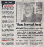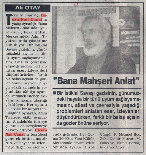 Tecrübeli sanatçı Hasan Nail Canat'ın yazıp oynadığı 'Bana Mahşeri Anlat' adlı tiyatro eseri, Feza Kültür Merkezi'ndeki Adım Tiyatrosu'nda gösterime sunuluyor. Bir İstiklal Savaşı gazisinin, günümüzdeki hayata bir türlü uyum sağlayamamasını, ailesi ve çevresiyle yaşadığı problemleri anlatan eser, izleyenleri düşündürürken, farklı bir bakış açısını da gözler önüne seriyor. Duygu yüklü sahnelerin yoğunlukta olduğu oyunda, verilmek istenen mesajın amacına ulaştığı görülüyor. Her oyunu kalabalık bir izleyici topluluğuna oynayan Adım Tiyatrosu ekibi, oyunlarını Anadolu'da turneye çıkarak da sergilemeye devam ediyor. Hasan Nail Canat'ın tecrübesi genç ekibinin amatör ruh ve heyecanı izlenmeye değer bir eser vücuda getirmiş. Her cuma 20.00'de Feza Kültür Merkezi'nde devam eden oyunda ayrıca Birol Cürgül, F. Mehmet Koç, Zeki Demir Murat, M. Palas ve Hikmet Sarıoğlu da yer alıyor.