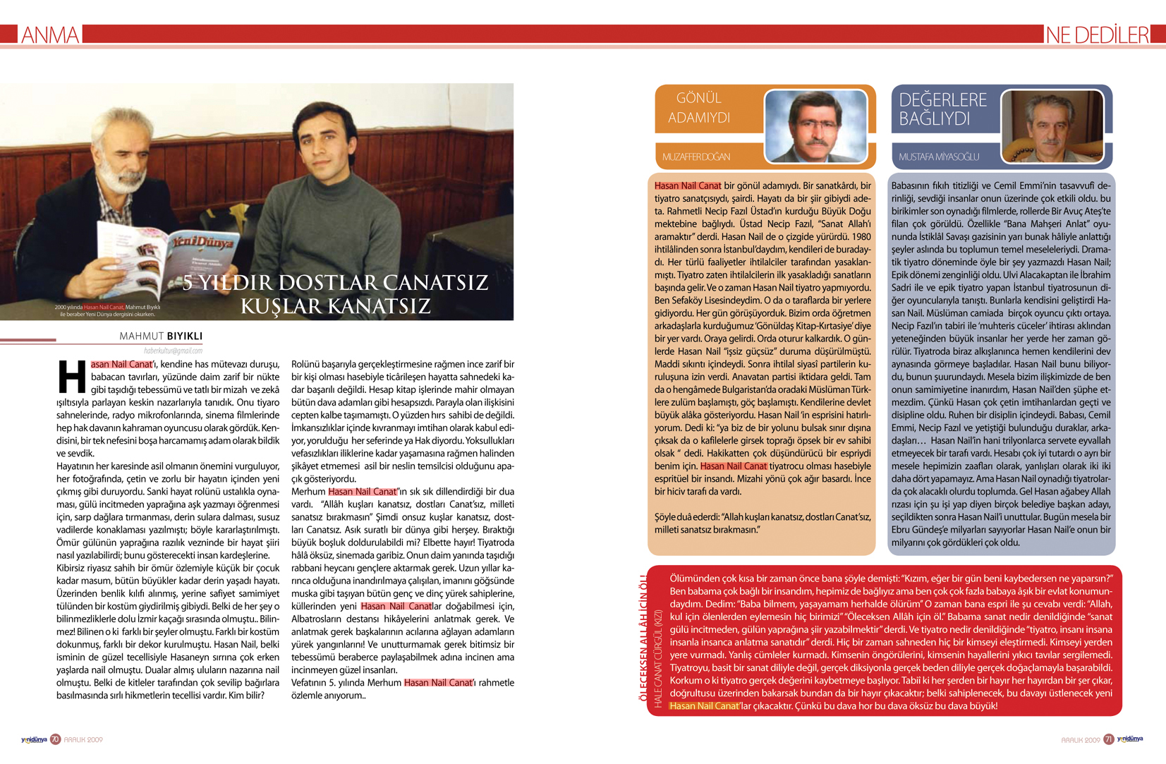 5 yıldır dostlar Canatsız kuşlar kanatsız Yeni Dünya Dergisi / 01.12.2009 Hasan Nail Canat’ı, kendine has mütevazı duruşu, babacan tavırları, yüzünde daim zarif bir nükte gibi taşıdığı tebessümü ve tatlı bir mizah ve zekâ ışıltısıyla parlayan keskin nazarlarıyla tanıdık. Onu tiyaro sahnelerinde, radyo mikrofonlarında, sinema filmlerinde hep hak davanın kahraman oyuncusu olarak gördük. Kendisini, bir tek nefesini boşa harcamamış adam olarak bildik ve sevdik. Hayatının her karesinde asil olmanın önemini vurguluyor, her fotoğrafında, çetin ve zorlu bir hayatın içinden yeni çıkmış gibi duruyordu. Sanki hayat rolünü ustalıkla oynaması, gülü incitmeden yaprağına aşk yazmayı öğrenmesi için, sarp dağlara tırmanması, derin sulara dalması, susuz vadilerde konaklaması yazılmıştı; böyle kararlaştırılmıştı. Ömür gülünün yaprağına razılık vezninde bir hayat şiiri nasıl yazılabilirdi; bunu gösterecekti insan kardeşlerine. Kibirsiz riyasız sahih bir ömür özlemiyle küçük bir çocuk kadar masum, bütün büyükler kadar derin yaşadı hayatı. Üzerinden benlik kılıfı alınmış, yerine safiyet samimiyet tülünden bir kostüm giydirilmiş gibiydi. Belki de her şey o