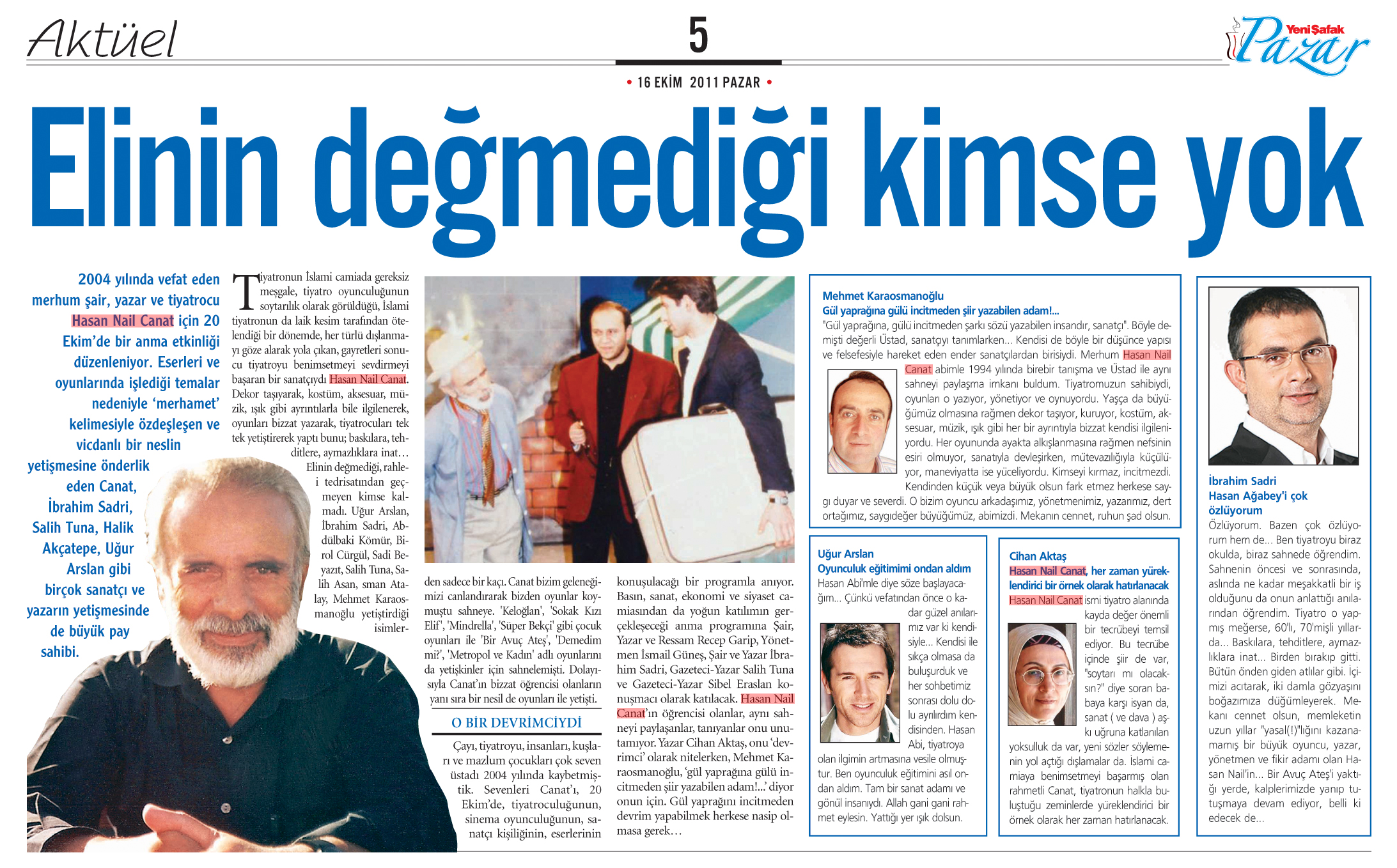 Çayı, tiyatroyu, insanları, kuşları ve mazlum çocukları çok seven üstadı 2004 yılında kaybetmiştik. Sevenleri Canat'ı, 20 Ekim'de, tiyatroculuğunun, sinema oyunculuğunun, sanatçı kişiliğinin, eserlerinin konuşulacağı bir programla anıyor. Basın, sanat, ekonomi ve siyaset camiasından da yoğun katılımın gerçekleşeceği anma programına Şair, Yazar ve Ressam Recep Garip, Yönetmen İsmail Güneş, Şair ve Yazar İbrahim Sadri, Gazeteci-Yazar Salih Tuna ve Gazeteci-Yazar Sibel Eraslan konuşmacı olarak katılacak. Hasan Nail Canat'ın öğrencisi olanlar, aynı sahneyi paylaşanlar, tanıyanlar onu unutamıyor. Yazar Cihan Aktaş, onu 'devrimci' olarak nitelerken, Mehmet Karaosmanoğlu, 'gül yaprağına gülü incitmeden şiir yazabilen adam!...' diyor onun için. Gül yaprağını incitmeden devrim yapabilmek herkese nasip olmasa gerek...