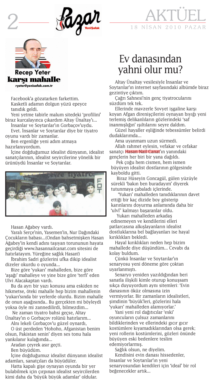 Recep Yeter / Ev danasından yahni olur mu? Yeni Şafak Gazetesi / 18.04.2010 Facebook'a gözatarken farkettim. Kasketli adamın dolgun yüzü epeyce tanıdık geldi. Yeni yetme tabirle malum sitedeki 'profilini' biraz kurcalayınca çıkardım Altay Ünaltay'ı... İnsanlar ve Soytarılar'ın Gorbaçov'uydu. Evet. İnsanlar ve Soytarılar diye bir tiyatro oyunu vardı bir zamanlar. Ben ergenliğe yeni adım atmaya hazırlanıyordum. İçine doğduğumuz idealist dünyanın, idealist sanatçılarının, idealist seyircilerine yönelik bir ürünüydü İnsanlar ve Soytarılar. Hasan Ağabey vardı. Yaralı Serçe'nin, Yasemen'in, Nur Dağındaki Çocukların babası... ( Ondan bahsetmişken Hasan Ağabey'in kendi adını taşıyan torununun hayata geçirdiği www.hasannailcanat.com sitesini de hatırlatayım. Yüreğine sağlık Hasan! ) İbrahim Sadri gözlerini ufka dikip idealist dizeler okurdu o oyunda... Bize göre 'yukarı' mahalleden, bize göre 'aşağı' mahalleye ve yine bize göre 'terfi' eden Ulvi Alacakaptan vardı. Bu da ayrı bir yazı konusu ama eskiden ne hikmetse, öteki mahalle hep bizim mahallenin 'yukarı'sında bir yerlerde olurdu. Bizim mahalle de onun aşağısında.. Bu gerçekten mi böyleydi yoksa öyle mi zannedilirdi, bilmezdim... Ne zaman tiyatro bahsi geçse, Altay Ünaltay'ın o Gorbaçov rolünü hatırlarım... Alnı lekeli Gorbaçov'u güzel oynardı, O üst perdeden 'Hohoho, Afganistan benim olsun, Pakistan senin' diyen ses tonu hala yankılanır kulağımda... Aradan çeyrek asır geçti. Ben büyüdüm. İçine doğduğumuz idealist dünyanın idealist adamları, sanatçıları da büyüdüler. Hatta kapalı gişe oynayan oyunda bir yer bulabilmek için çırpınan idealist seyircilerden kimi daha da 'büyük büyük adamlar' oldular. Altay Ünaltay vesilesiyle İnsanlar ve Soytarılar'ın internet sayfasındaki albümde biraz gezintiye çıktım. Çağrı Sahnesi'nin genç tiyatrocularını süzdüm tek tek. Ellerinde mavzerle Sovyet işgaline karşı koyan Afgan direnişçilerini oynayan bıyığı yeni terlemiş delikanlıların gözlerindeki 'saf inanmışlığın' ışıltılarını seyre daldım. Güzel hayaller eşliğinde tebessümler belirdi dudaklarımda... Ama uyanmam uzun sürmedi. Allah rahmet eylesin, vefakar ve cefakar sanatçı Hasan Nail Canat'ın yanındaki gençlerin her biri bir yana dağıldı. Pek çoğu hem cismen, hem ismen büyüyen idealist dostlarının gölgesinde kayboldu gitti. Biraz Hüseyin Goncagül, gülen yüzüyle sürekli 'bakın ben buradayım' diyerek tutunmaya çabaladı içlerinde. 'Yukarı' mahalleden tanıdıklarının davet ettiği bir kaç dizide boy gösterip karınlarını doyurma anlamında daha bir 'ulvî" kalmayı başaranlar oldu. Yukarı mahalleden arkadaş edinemeyen ve kendilerini elleri patlarcasına alkışlayanların idealist dostluklarına bel bağlayanları ise hayal kırıklıkları bekledi. Hayal kırıklıkları neden hep bizim mahallede diye düşündüm... Cevabı da kolay buldum. Çünkü İnsanlar ve Soytarılar'ın senaryosu yeni döneme göre çoktan uyarlanmıştı. Senaryo yeniden yazıldığından beri sanatla ilişkili kimle oturup konuşsam sıkça duyuyordum aynı sitemleri: 'Evin danasının öküz olmasına izin vermiyorlar. Bir zamanların idealistleri, şimdinin 'büyük'leri, gözlerini hala 'yukarı' mahalleden alamıyorlar.' Yani yeni rol dağıtıcılar 'eski' oyuncuların çulsuz zamanlarını bildiklerinden ve ellerindeki gıcır gıcır kostümlere kıyamadıklarından olsa gerek; yeni rollerin kostümlerini, gözleri önünde büyüyen eski bedenlere teslim edemiyorlarmış. Sağlık olsun, ne diyelim. Kendisini evin danası hissedenler, İnsanlar ve Soytarılar'ın yeni senaryosundan kendileri için 'ideal' bir rol beğenecekler artık... |