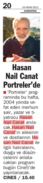 Hasan Nail Canat'ın ailesinin ve dostlarının Hasan Nail Canat ile ilgili hatıralarını, duygu ve düşüncelerini anlatacakları program bugün Cine5'de yayınlanacak.