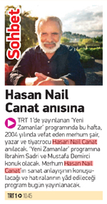 TRT 1'de yayınlanan 'Yeni Zamanlar' programında bu hafta, 2004 yılında vefat eden merhum şair, yazar ve tiyatrocu Hasan Nail Canat anılacak. 'Yeni Zamanlar' programına İbrahim Sadri ve Mustafa Demirci konuk olacak. Merhum Hasan Nail Canat'ın sanat anlayışının konuşulacağı ve hatıralarının yâd edileceği program bugün yayınlanacak.
