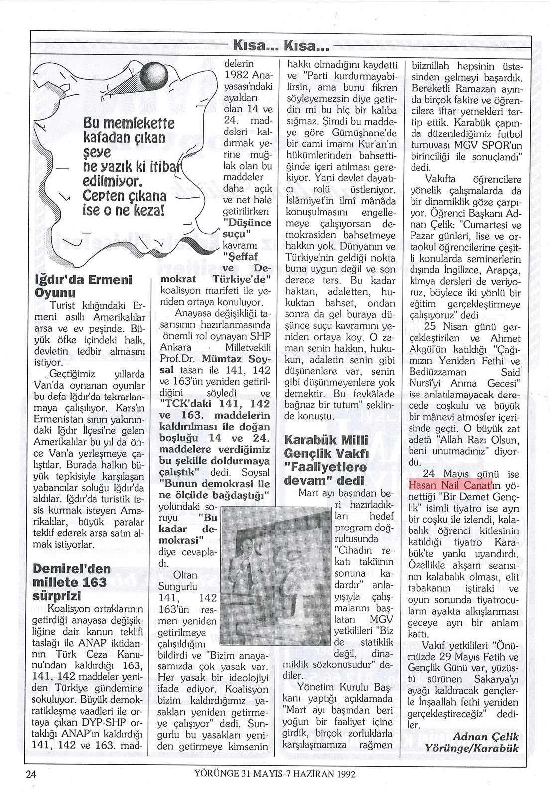 Karabük Milli Gençlik Vakfı "Faaliyetlere devam" dedi Yörünge Dergisi / 31.05.1992 Mart ayı başından beri hazırladıkları hedef program doğrultusunda "Cihadın rekatı takîînın sonuna kadardır" anlayışıyla çalışmalarını başlatan MGV yetkilileri "Biz de statiklik değil, dinamiklik sözkonusudur" dediler. Yönetim Kurulu Başkanı yaptığı açıklamada "Mart ayı başından beri yoğun bir faaliyet içine girdik, birçok zorluklarla karşılaşmamıza rağmen biiznillah hepsinin üstesinden gelmeyi başardık. Bereketli Ramazan ayında birçok fakire ve öğrencilere iftar yemekleri tertip ettik. Karabük çapında düzenlediğimiz futbol turnuvası MGV SPOR'un birinciliği ile sonuçlandı" dedi. Vakıfta öğrencilere yönelik çalışmalarda da bir dinamiklik göze çarpıyor. Öğrenci Başkanı Adnan Çelik: "Cumartesi ve Pazar günleri, lise ve ortaokul öğrencilerine çeşitli konularda seminerlerin dışında İngilizce, Arapça, kimya dersleri de veriyoruz, böylece iki yönlü bir eğitim gerçekleştirmeye çalışıyoruz" dedi. 25 Nisan günü gerçekleştirilen ve Ahmet Akgül'ün katıldığı "Çağımızın Yeniden Fethi ve Bediüzzaman Said Nursî'yi Anma Gecesi" ise anlatılamayacak derecede coşkulu ve büyük bir manevi atmosfer içerisinde geçti. O büyük zat adeta "Allah razı olsun, beni unutmadınız" diyordu. 24 Mayıs günü ise Hasan Nail Canat'ın yönettiği "Bir Demet Gençlik" isimli tiyatro ise ayrı bir coşku ile izlendi, kalabalık öğrenci kitlesinin katıldığı tiyatro Karabük'te büyük yankı uyandırdı. Özellikle akşam seansının kalabalık olması, elit tabakanın iştiraki ve oyun sonunda tiyatrocuların ayakta alkışlanması geceye ayrı bir anlam kattı. Vakıf yetkilileri "Önümüzdeki 29 Mayıs Fetih ve Gençlik Günü var, yüzüstü sürünen Sakarya'yı ayağa kaldıracak gençlerle İnşaAllah fethi yeniden gerçekleştireceğiz" dediler. Adnan Çelik Kaynak: Yörünge Dergisi |