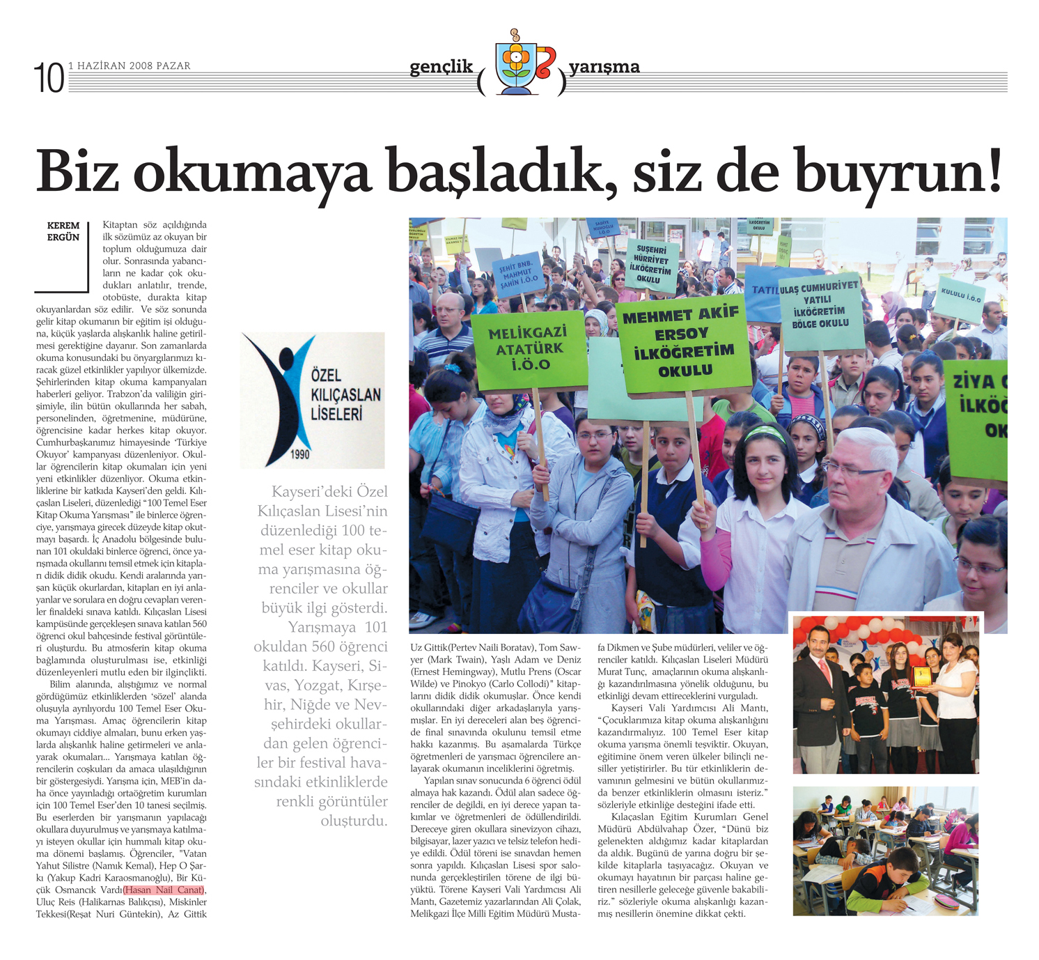 Biz okumaya başladık, siz de buyrun! Zaman Gazetesi / 01.06.2008 Kitaptan söz açıldığında ilk sözümüz az okuyan bir toplum olduğumuza dair olur. Sonrasında yabancıların ne kadar çok okudukları anlatılır, trende, otobüste, durakta kitap okuyanlardan söz edilir. Ve söz sonunda gelir kitap okumanın bir eğitim işi olduğuna, küçük yaşlarda alışkanlık haline getirilmesi gerektiğine dayanır. Son zamanlarda okuma konusundaki bu önyargılarımızı kıracak güzel etkinlikler yapılıyor ülkemizde. Şehirlerinden kitap okuma kampanyaları haberleri geliyor. Trabzon’da valiliğin girişimiyle, ilin bütün okullarında her sabah, personelinden, öğretmenine, müdürüne, öğrencisine kadar herkes kitap okuyor. Cumhurbaşkanımız himayesinde ‘Türkiye Okuyor’ kampanyası düzenleniyor. Okullar öğrencilerin kitap okumaları için yeni yeni etkinlikler düzenliyor. Okuma etkinliklerine bir katkıda Kayseri’den geldi. Kılıçaslan Liseleri, düzenlediği “100 Temel Eser Kitap Okuma Yarışması” ile binlerce öğrenciye, yarışmaya girecek düzeyde kitap okutmayı başardı. İç Anadolu bölgesinde bulunan 101 okuldaki binlerce öğrenci, önce yarışmada okullarını temsil etmek için kitapları didik didik okudu. Kendi aralarında yarışan küçük okurlardan, kitapları en iyi anlayanlar ve sorulara en doğru cevapları verenler finaldeki sınava katıldı. Kılıçaslan Lisesi kampüsünde gerçekleşen sınava katılan 560 öğrenci okul bahçesinde festival görüntüleri oluşturdu. Bu atmosferin kitap okuma bağlamında oluşturulması ise, etkinliği düzenleyenleri mutlu eden bir ilginçlikti. Bilim alanında, alıştığımız ve normal gördüğümüz etkinliklerden ‘sözel’ alanda oluşuyla ayrılıyordu 100 Temel Eser Okuma Yarışması. Amaç öğrencilerin kitap okumayı ciddiye almaları, bunu erken yaşlarda alışkanlık haline getirmeleri ve anlayarak okumaları... Yarışmaya katılan öğrencilerin coşkuları da amaca ulaşıldığının bir göstergesiydi. Yarışma için, MEB’in daha önce yayınladığı ortaöğretim kurumları için 100 Temel Eser’den 10 tanesi seçilmiş. Bu eserlerden bir yarışmanın yapılacağı okullara duyurulmuş ve yarışmaya katılmayı isteyen okullar için hummalı kitap okuma dönemi başlamış. Öğrenciler, "Vatan Yahut Silistre (Namık Kemal), Hep O Şarkı (Yakup Kadri Karaosmanoğlu), Bir Küçük Osmancık Vardı(Hasan Nail Canat), Uluç Reis (Halikarnas Balıkçısı), Miskinler Tekkesi(Reşat Nuri Güntekin), Az Gittik Uz Gittik(Pertev Naili Boratav), Tom Sawyer (Mark Twain), Yaşlı Adam ve Deniz (Ernest Hemingway), Mutlu Prens (Oscar Wilde) ve Pinokyo (Carlo Collodi)" kitaplarını didik didik okumuşlar. Önce kendi okullarındaki diğer arkadaşlarıyla yarışmışlar. En iyi dereceleri alan beş öğrencide final sınavında okulunu temsil etme hakkı kazanmış. Bu aşamalarda Türkçe öğretmenleri de yarışmacı öğrencilere anlayarak okumanın inceliklerini öğretmiş. Yapılan sınav sonucunda 6 öğrenci ödül almaya hak kazandı. Ödül alan sadece öğrenciler de değildi, en iyi derece yapan takımlar ve öğretmenleri de ödüllendirildi. Dereceye giren okullara sinevizyon cihazı, bilgisayar, lazer yazıcı ve telsiz telefon hediye edildi. Ödül töreni ise sınavdan hemen sonra yapıldı. Kılıçaslan Lisesi spor salonunda gerçekleştirilen törene de ilgi büyüktü. Törene Kayseri Vali Yardımcısı Ali Mantı, Gazetemiz yazarlarından Ali Çolak, Melikgazi İlçe Milli Eğitim Müdürü Mustafa Dikmen ve Şube müdürleri, veliler ve öğrenciler katıldı. Kılıçaslan Liseleri Müdürü Murat Tunç, amaçlarının okuma alışkanlığı kazandırılmasına yönelik olduğunu, bu etkinliği devam ettireceklerini vurguladı. Kayseri Vali Yardımcısı Ali Mantı, “Çocuklarımıza kitap okuma alışkanlığını kazandırmalıyız. 100 Temel Eser kitap okuma yarışma önemli teşviktir. Okuyan, eğitimine önem veren ülkeler bilinçli nesiller yetiştirirler. Bu tür etkinliklerin devamının gelmesini ve bütün okullarımızda benzer etkinliklerin olmasını isteriz.” sözleriyle etkinliğe desteğini ifade etti. |