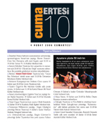 [Tiyatro/Gösteri] Zaman Gazetesi / 04.02.2006 Zaman Gazetesi Genel Yayın Müdürü Ekrem Dumanlı'nın Son Duruşma adlı oyunu 27 Ocak 2006 saat 20:30'da Fırat Kültür Merkezi'nde sahnelenecek. 0212 517 46 97 Reşat Nuri Güntekin'in aynı adlı eserinden uyarlanan Çalıkuşu, 25-29 Ocak tarihleri arasında Şehir Tiyatroları Ümraniye Sahnesi'nde. 0216 634 26 70 Altıdan Sonra Tiyatro'nun geçen yıl büyük beğeni toplayan oyunu Ortak Bölenlerin En Büyüğü-OBEB 23 Ocak'ta Beyoğlu'ndaki Maya Sahnesi'nde. Yılmaz Erdoğan'ın yönettiği Haybeden Gerçeküstü Aşk, 21-29 Ocak tarihleri arasında Beşiktaş Kültür Merkezi'nde. 0212 260 11 56 Aytekin Özen'in yönettiği Çiçek, Patron, Böcek yarın Yunus Emre Kültür Merkezi'nde. 212 661 19 42 Zafer Ergin ve Deniz Türkali'nin oynadığı Kuklacı adlı yeni oyun 26 Ocak saat 21.00'de Profilo Kültür Merkezi'nde. 212 216 93 14 Semaver Kumpanya'nın Süleyman ve Öbürsüler adlı oyunu bugün İzmit Halk Eğitim Merkezi'nde. Yanlışlıklar Komedisi'ni bugün saat 20.00'de Tiyatro Pera'da izleyebilirsiniz. 0212 245 44 60 Bizbize Hasan Nail Canat Tiyatrosu'nun sahnelediği "Tarçın Bey Evleniyor" başlıklı oyunu yarın 18.00'de Altunizade Kültür Merkezi'nde. 0212 310 12 53 Oktay Rıfat'ın yazdığı "Yağmur Sıkıntısı", 24 Ocak saat 20.30'da Haldun Taner Sahnesi'nde. Zümrüdü Anka Tiyatrosu tarafından sahnelenen 'Hasreti Fatih' oyunu, 22 Ocak saat: 15.30'da Bahçelievler Belediye Tiyatro Salonunda sahnelenecek. 0212 441 36 80 |
