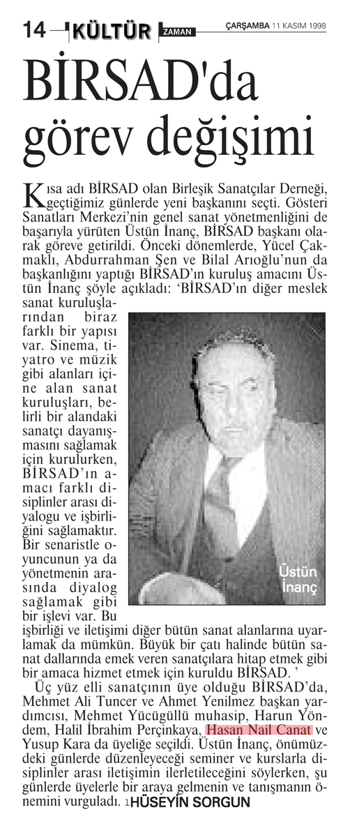 BİRSAD'da görev değişimi Zaman Gazetesi / 11.11.1998 Kısa adı BİRSAD olan Birleşik Sanatçılar Derneği, geçtiğimiz günlerde yeni başkanını seçti. Gösteri Sanatları Merkezi'nin genel sanat yönetmenliğini de başarıyla yürüten Üstün İnanç, BİRSAD başkanı olarak göreve getirildi. Önceki dönemlerde, Yücel Çakmaklı, Abdurrahman Şen ve Bilal Arıoğlu'nun da başkanlığını yaptığı BİRSAD'ın kuruluş amacını Üstün İnanç şöyle açıkladı: 'BİRSAD'ın diğer meslek sanat kuruluşlarından biraz farklı bir yapısı var. Sinema, tiyatro ve müzik gibi alanları içine alan sanat kuruluşları, belirli bir alandaki sanatçı dayanışmasını sağlamak için kurulurken, BİRSAD'ın amacı farklı disiplinler arası diyalogu ve işbirliğini sağlamaktır. Bir senaristle oyuncunun ya da yönetmenin arasında diyalog sağlamak gibi bir işlevi var. Bu işbirliği ve iletişimi diğer bütün sanat alanlarına uyarlamak da mümkün. Büyük bir çatı halinde bütün sanat dallarında emek veren sanatçılara hitap etmek gibi bir amaca hizmet etmek için kuruldu BİRSAD. Üç yüz elli sanatçının üye olduğu BİRSAD'da, Mehmet Ali Tuncer ve Ahmet Yenilmez başkan yardımcısı, Mehmet Yücügüllü muhasip, Harun Yöndem, Halil İbrahim Perçinkaya, Hasan Nail Canat ve Yusup Kara da üyeliğe seçildi. Üstün İnanç, önümüzdeki günlerde düzenleyeceği seminer ve kurslarla disiplinler arası iletişimin ilerletileceğini söylerken, şu günlerde üyelerle bir araya gelmenin ve tanışmanın önemini vurguladı. |