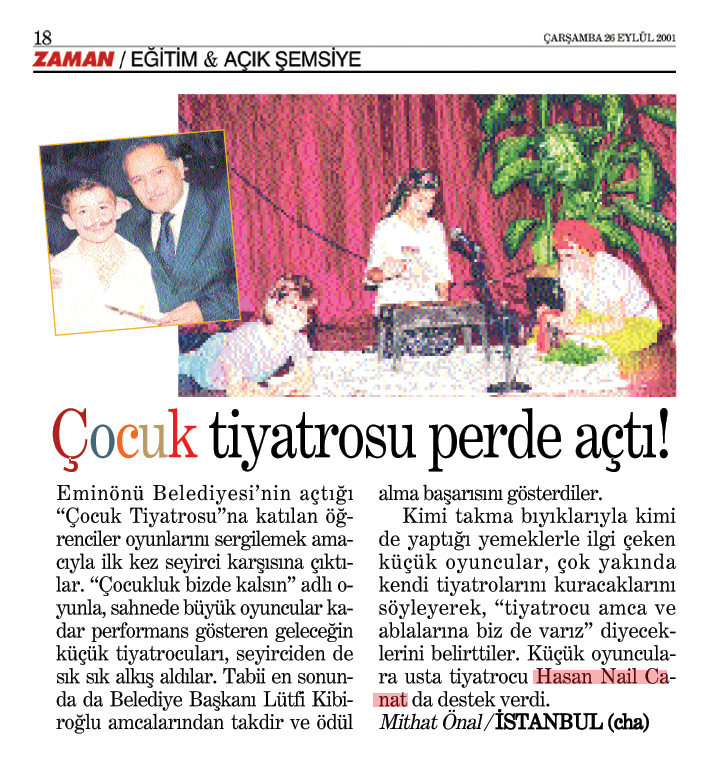 “Çocukluk bizde kalsın” adlı oyunla, sahnede büyük oyuncular kadar performans gösteren geleceğin küçük tiyatrocuları, seyirciden de sık sık alkış aldılar. Tabii en sonunda da Belediye Başkanı Lütfi Kibiroğlu amcalarından takdir ve ödül alma başarısını gösterdiler.